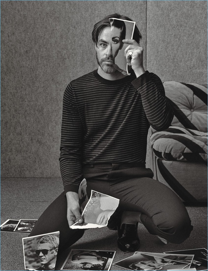 Chris Pine rummages through photographs of icons. Pine wears a Brunello Cucinelli striped sweater with Sandro trousers and Loewe shoes.