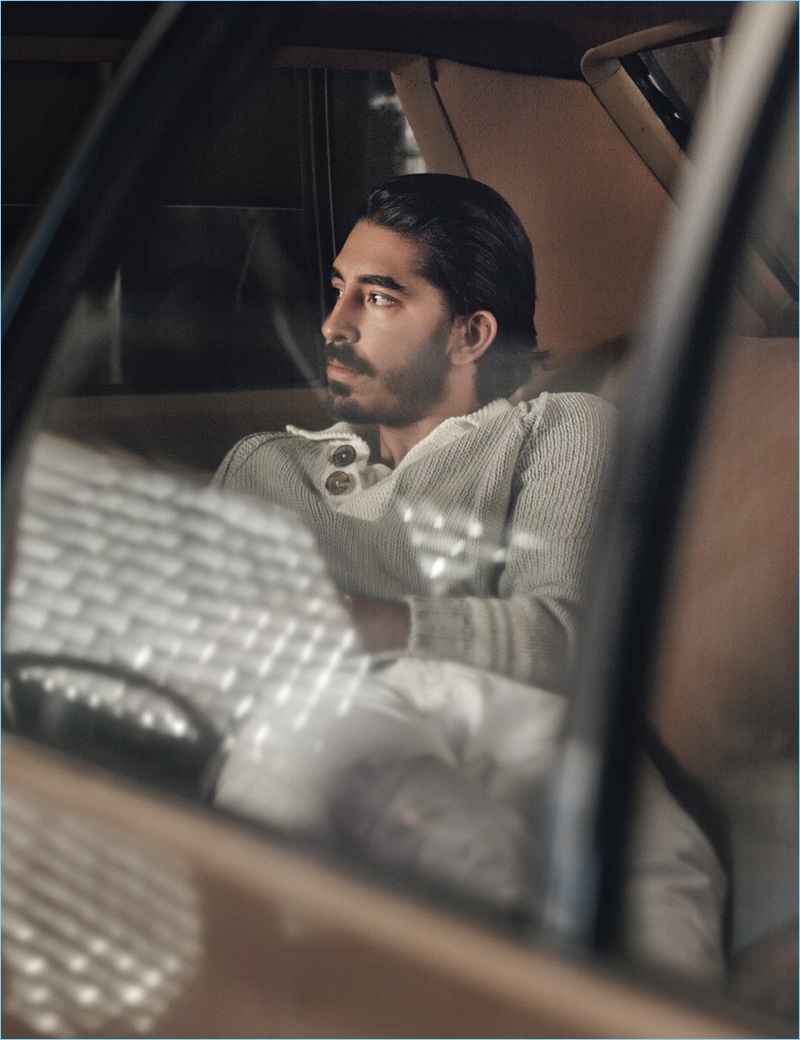 Dev Patel relaxes in the backseat of a car. Patel dons a Hermès sweater with Frame Denim jeans.