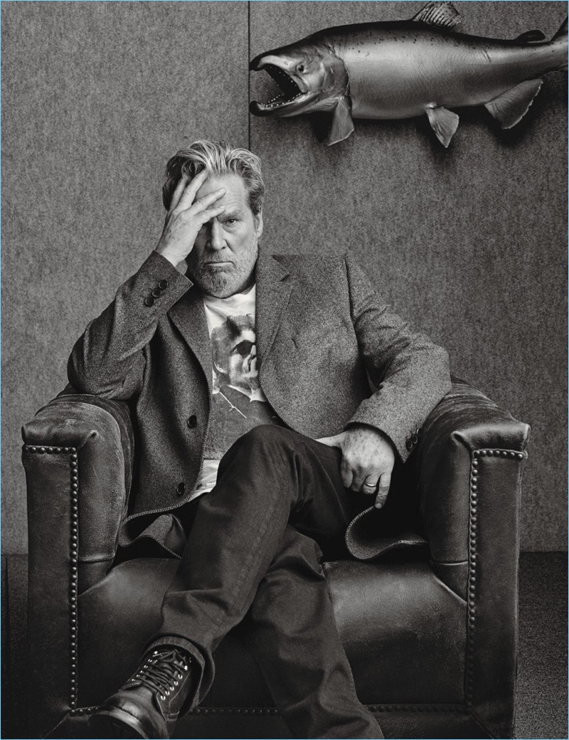 Jeff Bridges sits for a photo in a BOSS Hugo Boss coat, A.P.C. denim jeans, and Frye boots.