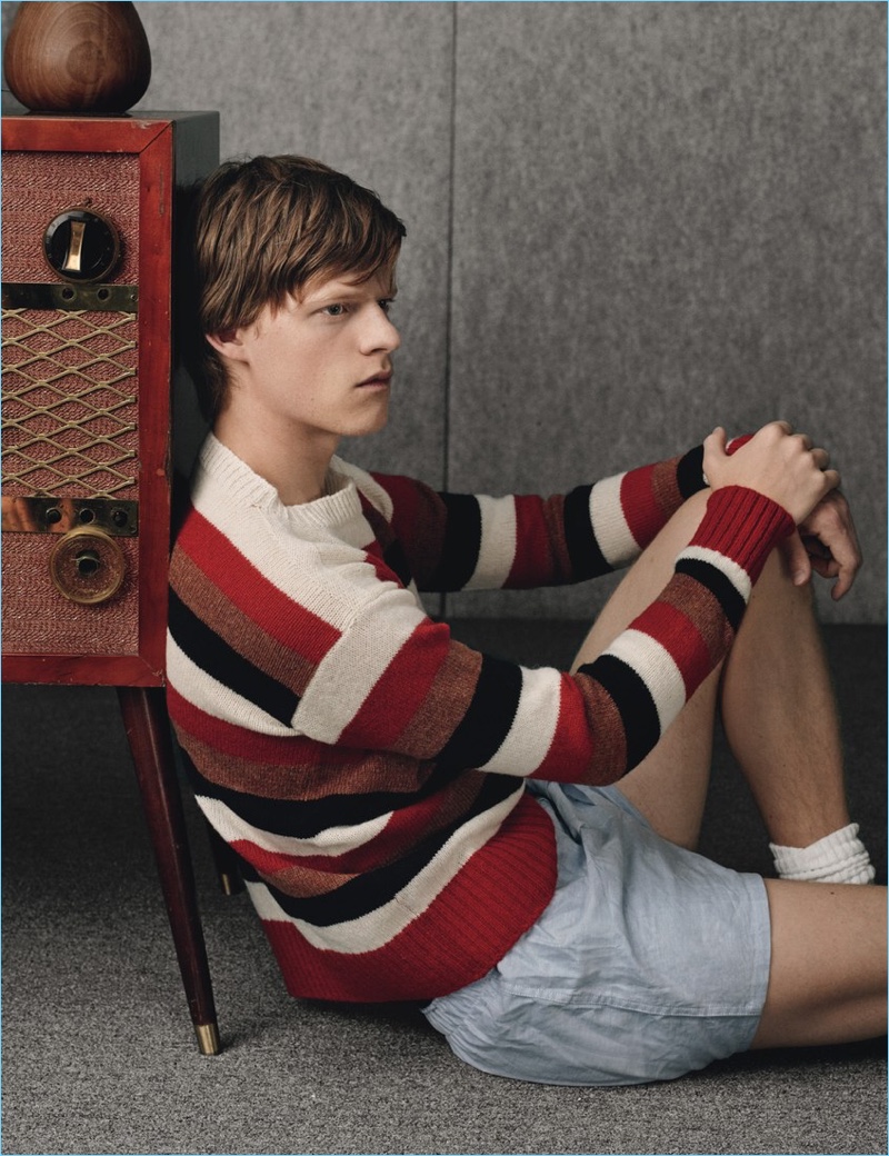 Lucas Hedges embraces boyish style in a Prada striped sweater and Brooks Brothers boxers.