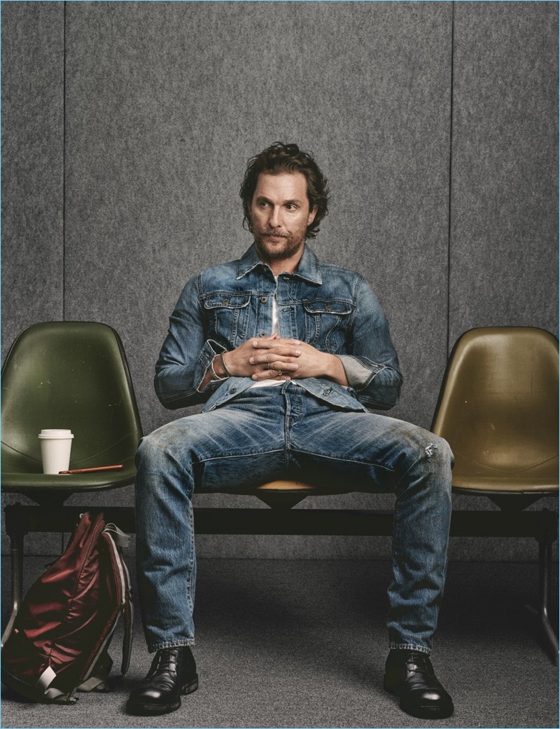Matthew McConaughey doubles down on denim for W magazine. McConaughey wears a denim AG jacket with a Current/Elliott t-shirt, Levi’s denim jeans, and Ann Demeulemeester boots.