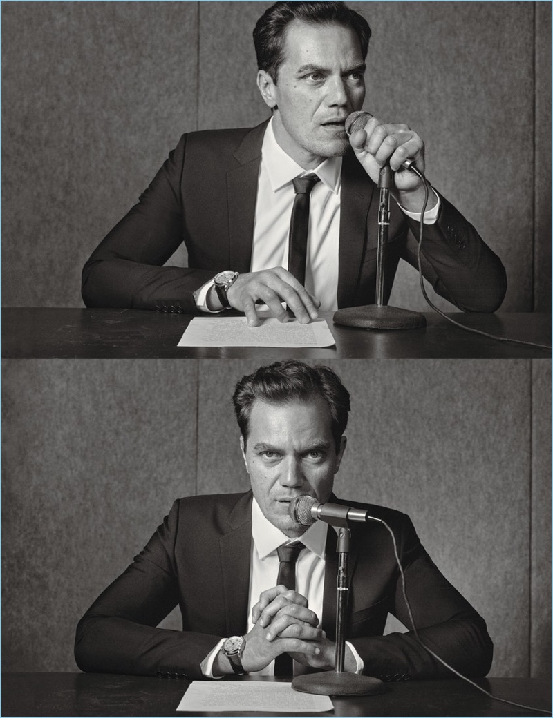 Michael Shannon steps into the role of anchor in a Saint Laurent jacket, shirt, and tie.