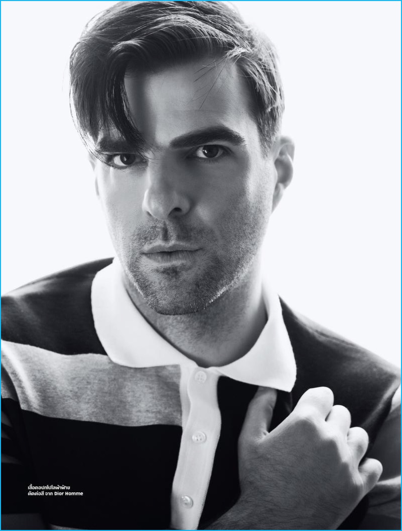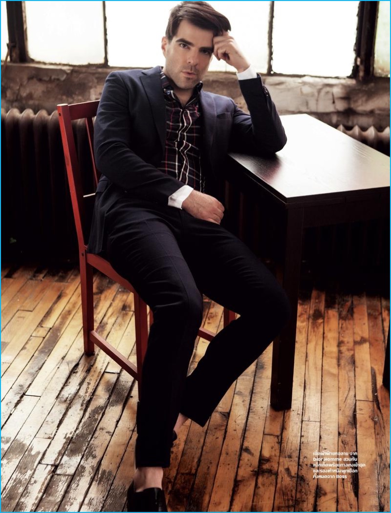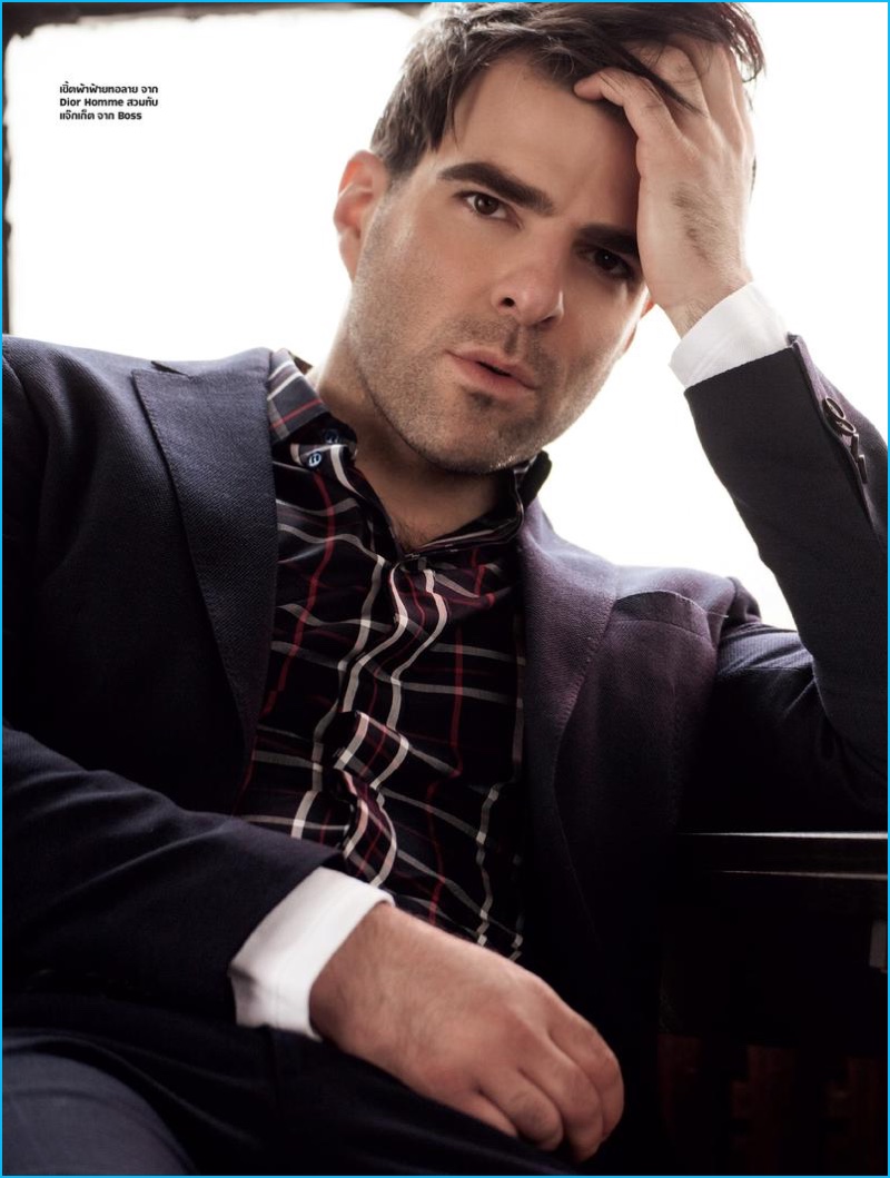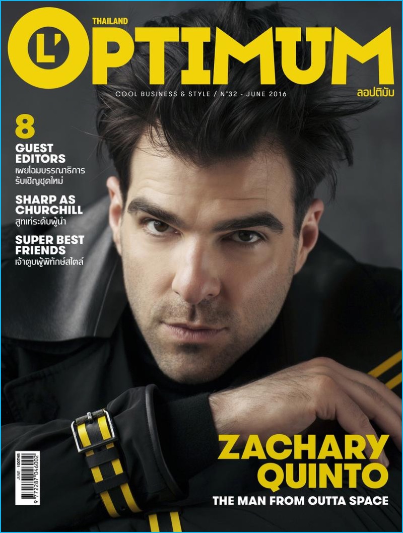 Ahead of the July 22, 2016 release of Star Trek Beyond, actor Zachary Quinto covers the June issue of L’Optimum Thailand. Quinto connects with photographer Brent Chua in New York City for a shoot. Embracing a designer wardrobe, the 39 year-old actor is styled by Danyl Geneciran. Wearing tailored suits from labels such as BOSS, Quinto is also pictured in staples like the Harrington jacket and polo shirt. Boasting quite the wardrobe of brands, Quinto dons Dior Homme, Valentino, Ermenegildo Zegna and more.
