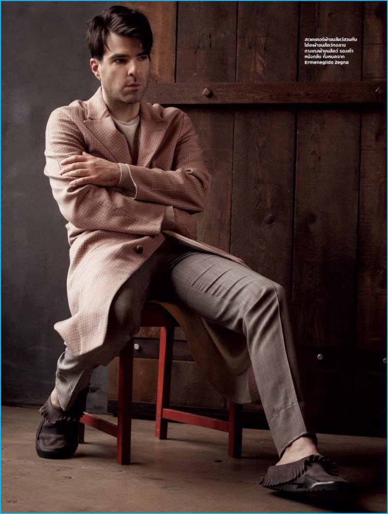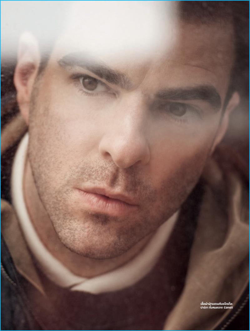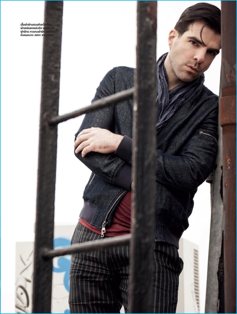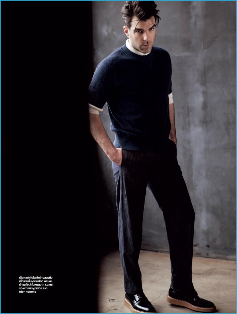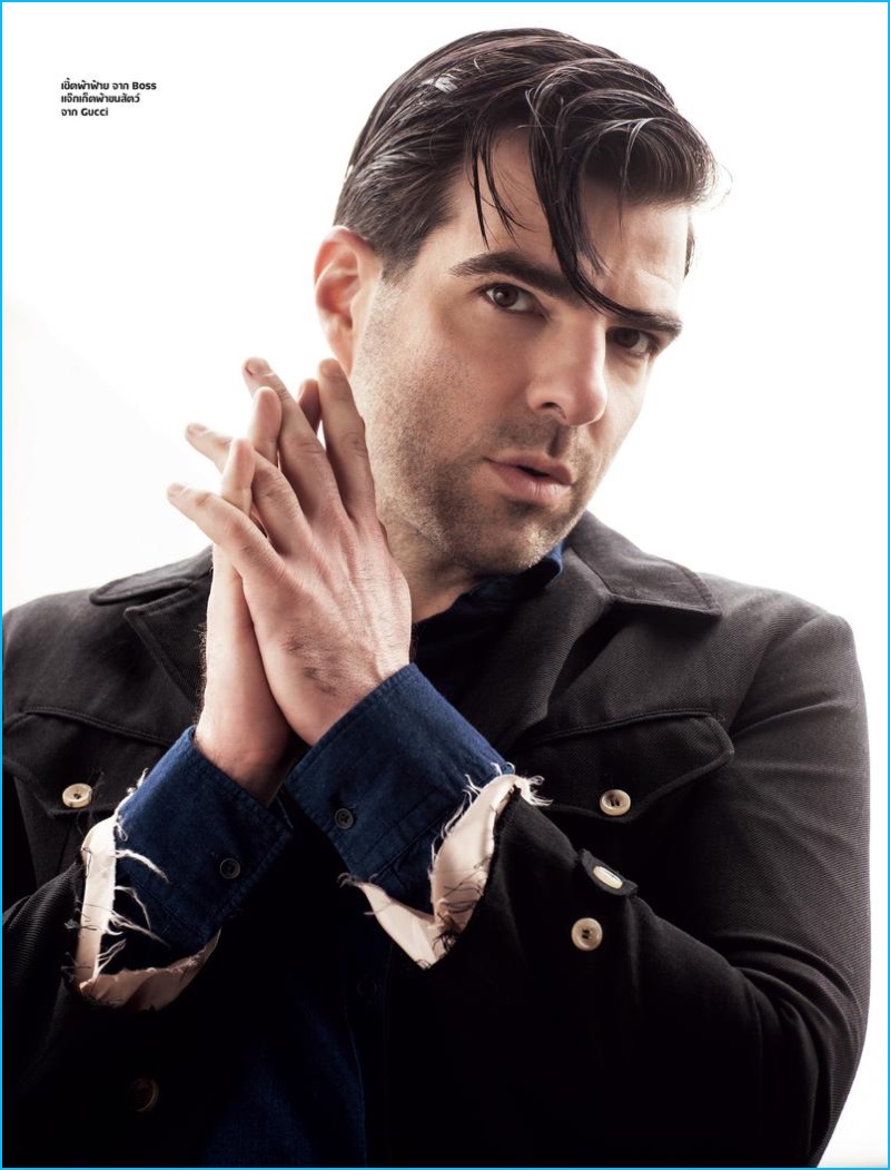 Ahead of the July 22, 2016 release of Star Trek Beyond, actor Zachary Quinto covers the June issue of L’Optimum Thailand. Quinto connects with photographer Brent Chua in New York City for a shoot. Embracing a designer wardrobe, the 39 year-old actor is styled by Danyl Geneciran. Wearing tailored suits from labels such as BOSS, Quinto is also pictured in staples like the Harrington jacket and polo shirt. Boasting quite the wardrobe of brands, Quinto dons Dior Homme, Valentino, Ermenegildo Zegna and more.