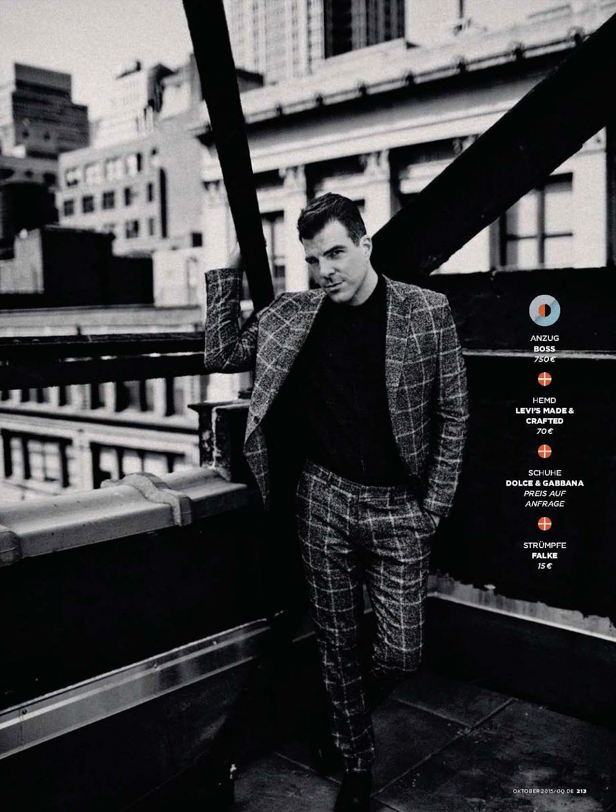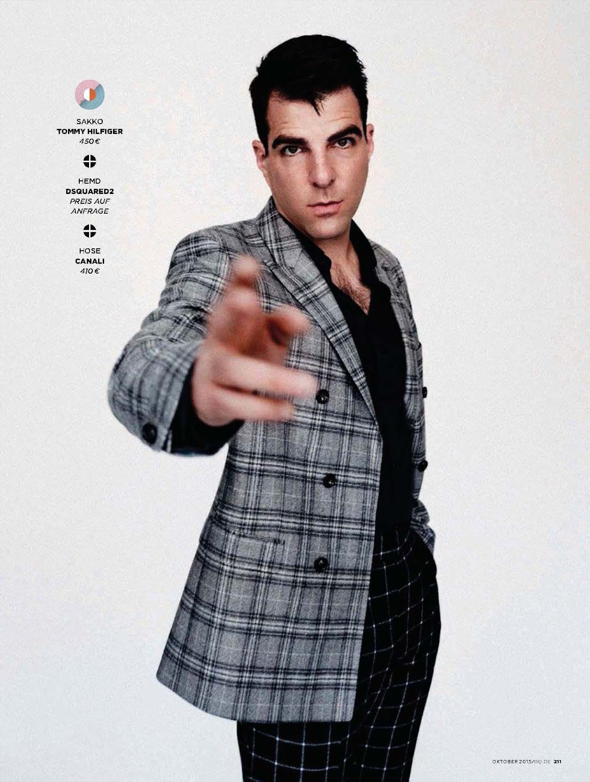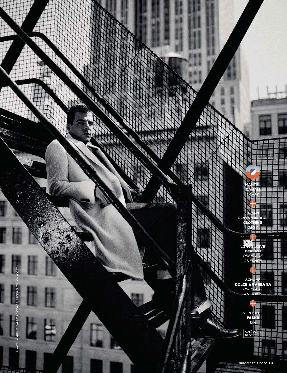 Zachary Quinto stars in a new photo shoot for the October 2015 issue of GQ Germany. Photographed by Billy Kidd, Quinto hits the studio with stylist Santa Bevacqua. Sporting luxurious fall styles, Quinto channels an effortless cool in Louis Vuitton, BOSS by Hugo Boss and other labels.Pin