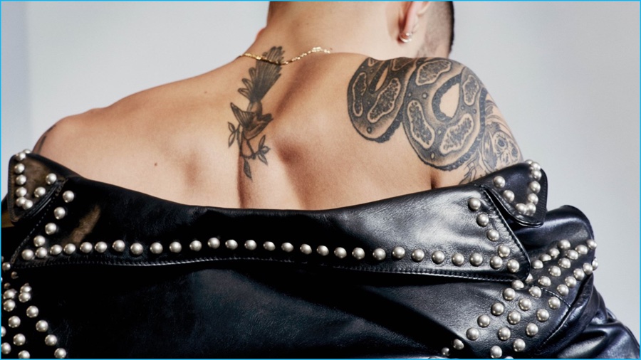 Zayn Malik poses for a mugshot, wearing a studded leather biker jacket from Marc Jacobs.Pin