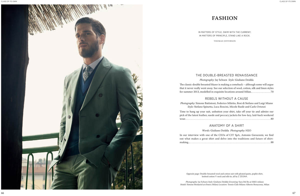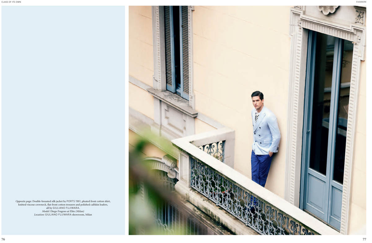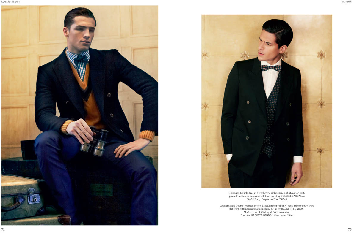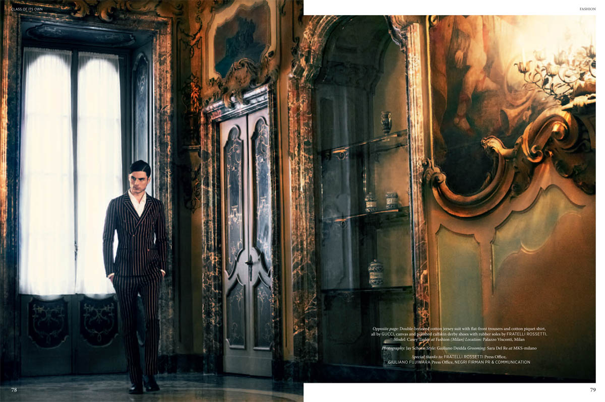 Class Acts–Photographer Jay Schoen gets behind the camera for the latest issue of Class of Its Own for a sartorial editorial spread featuring a polished cast of models. Starring Elbio Bonsaglio (Elite), Simone Bredariol (D’Men), Casey Taylor (Fashion), Edward Wilding (Fashion), Diego Fragoso (Elite), and Micah Dix (I Love Models), the editorial spread tells the story of Renaissance men and their clean, dapper wardrobes. Stylist Giuliano Deidda brings the inspiration to life, focusing in upon the sleek, timeless double-breasted jacket pulled from top menswear brands including Dolce & Gabbana, Gucci, and Z Zegna. / Grooming by Sara del Rey.
