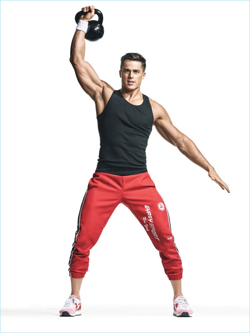Working out with a kettlebell, Pietro Boselli sports a Calvin Klein tank, Gypsy Sports sweatpants, a Gosha Rubchinskiy x Fila wristband, and Diadora sneakers.