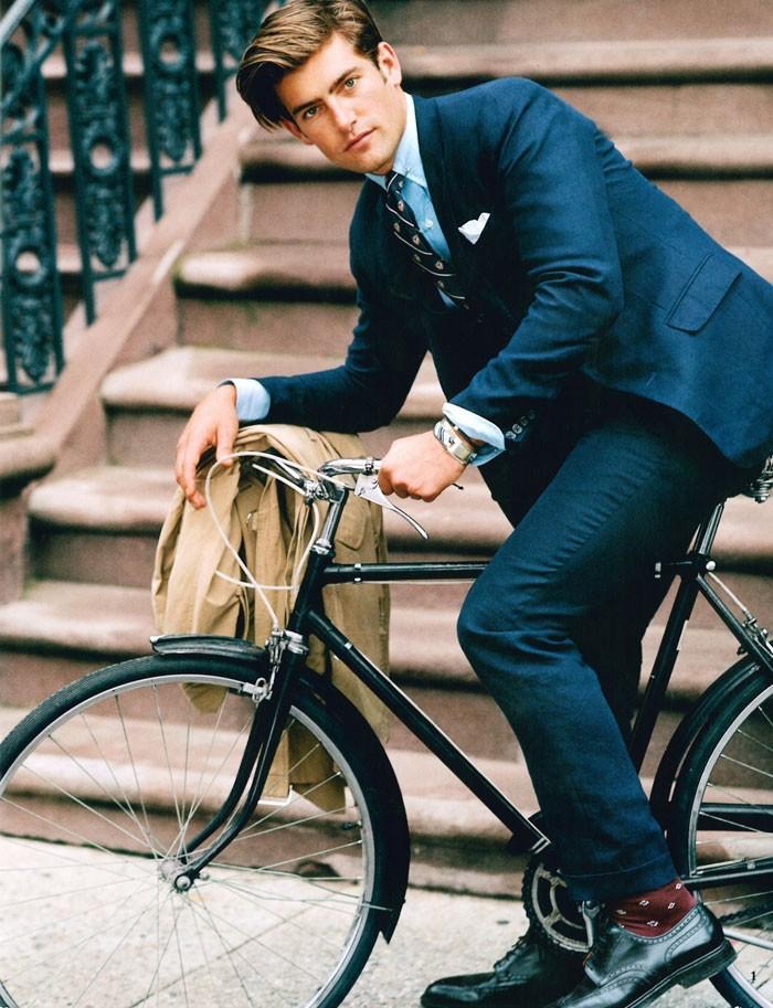 PinJustin Hopwood takes a bike ride in a smart Polo Ralph Lauren navy suit.