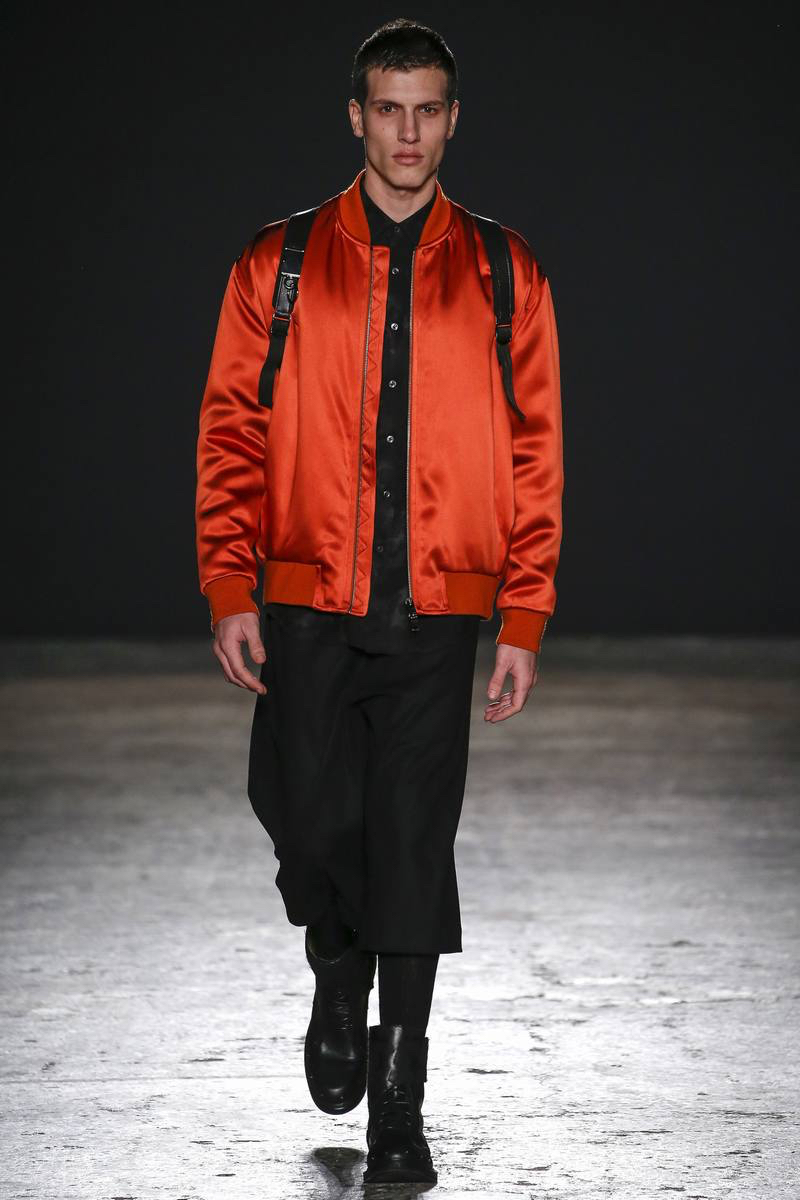 PinAdrian Cardoso takes to the catwalk in a bold orange bomber jacket from Ports 1961’s fall-winter 2016 men’s collection.