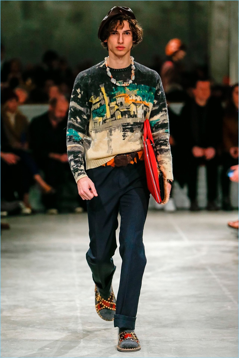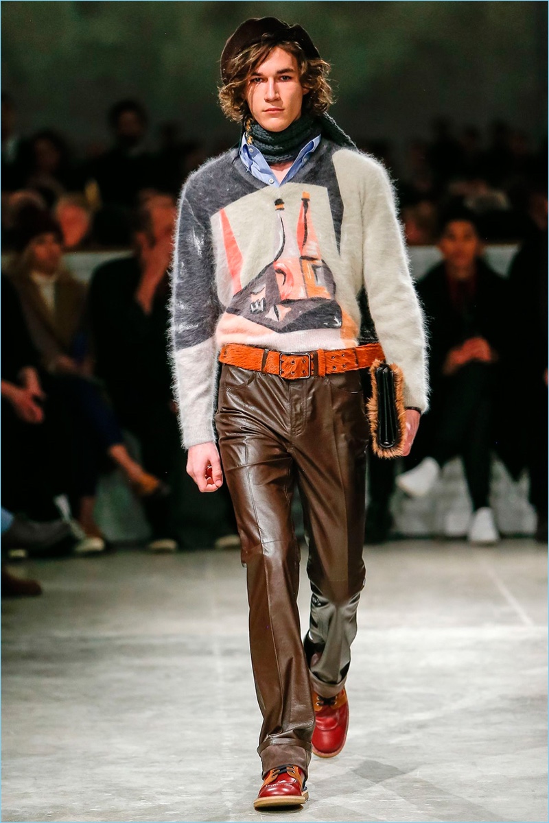 A relaxed but chic attitude reigns for the season. Slouchy trousers join boxy sweaters, leather jackets, smart button-down shirts, and tailored blazers. Prada’s hero pieces for fall include graphic knitwear and military-inspired outerwear.
