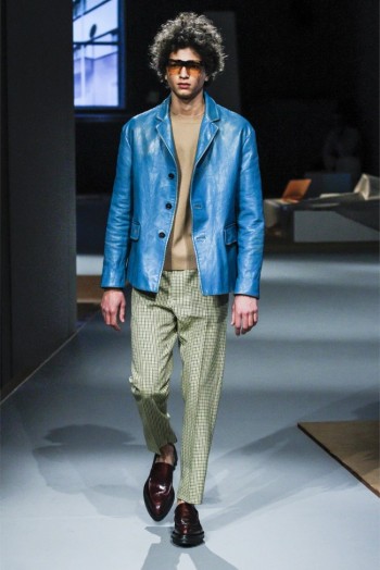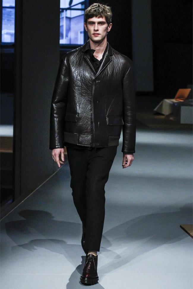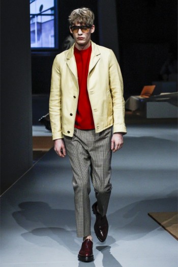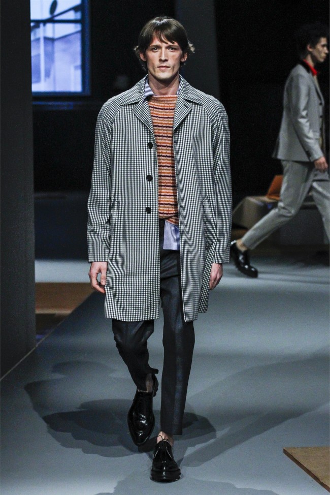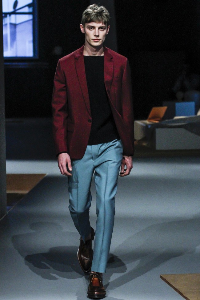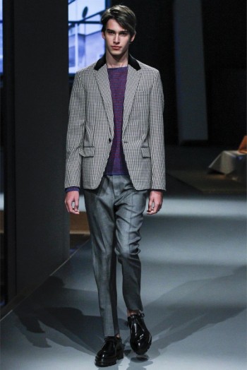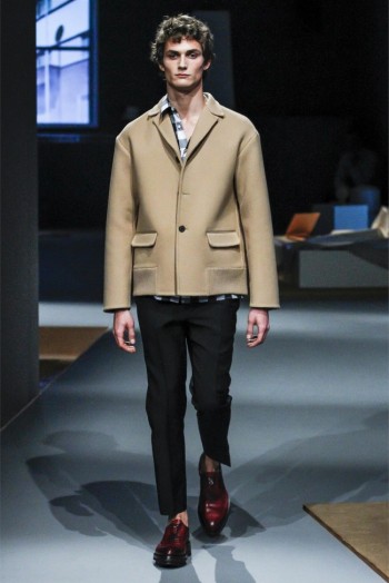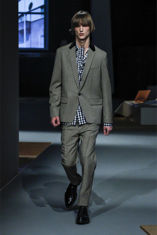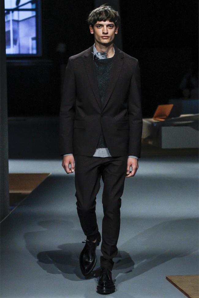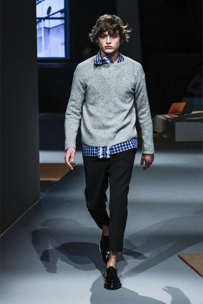 Prada Living–Taking aim at menswear fundamentals that men simply want to wear, Miuccia Prada continues to meld the past with the present. Creating apartment rooms as the backdrop of her fall/winter 2013 collection, Prada evoked easy living with a simplified wardrobe. Simple crewnecks with flat boxy necklines were non-fussy as were shirts with narrow lapels that peeked out from knits at times. Meanwhile, the tailoring was sharp and modern with outerwear presented in fantastic boxy shapes. Paired with narrow trousers, the outerwear and blazers this season provided an accessible mode with English checks and solid alternatives in colors ranging from black to camel.