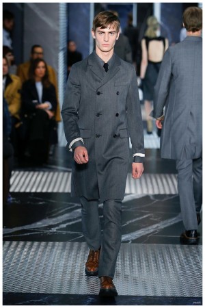Miuccia Prada put the history books on rest for her fall-winter 2015 menswear outing, instead going for a contemporary lineup that was simple but elegant. Embracing black, navy and gray, the Prada man was outfitted with a minimalist wardrobe that consisted of nylon coats and jackets that were juxtaposed with a modest range of tailored suiting and sportswear separates.