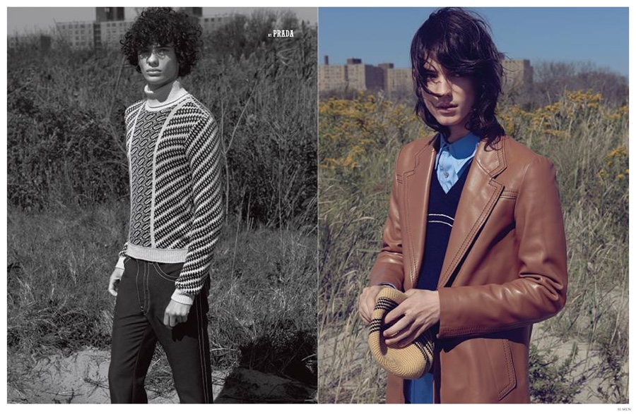 Prada Preview-British fashion magazine 10 Men gets an early start on spring with a look at Prada’s latest collection, designed by creative director Miuccia Prada. Models Gabriel Marques and Piero Mendez come together in an editorial shot by photographer Sharif Hamza. Outfitted by fashion editor Tony Irvine, Gabriel and Piero embrace the retro-infused attitude of Prada’s spring-summer 2015 collection, sporting luxury denim, knitwear and more.