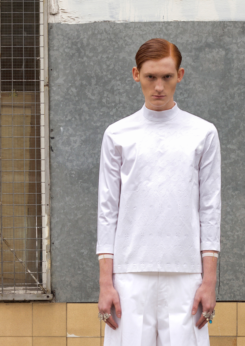 PrecisionCentral Saint Martins graduate Emma Clarke presents her latest collection for the spring/summer 2013 season. Focusing upon the detail, Emma Clarke meticulously explores intricate embroidery and rich texture within the fabrics. The line also features sleek, minimal silhouettes, including wide-cut trousers, cropped sleeves, and sharp, geometric cuts for a collection that balances both strong shapes and elaborate detail.