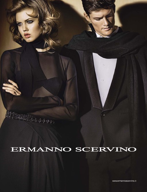 Ermanno Scervino Fall/Winter 2014 Campaign–Ready for a fine evening out, Danny Beauchamp joins beauty Lindsey Wixson for Ermanno Scervino’s fall/winter 2014 campaign. Dressed to kill, the British model is photographed in a black tuxedo and scarf.