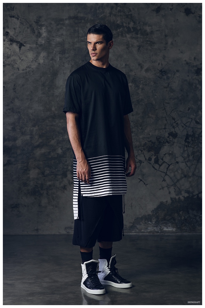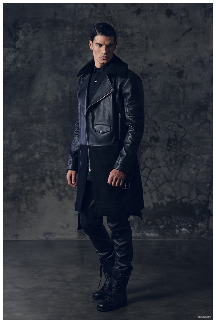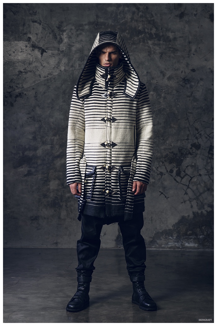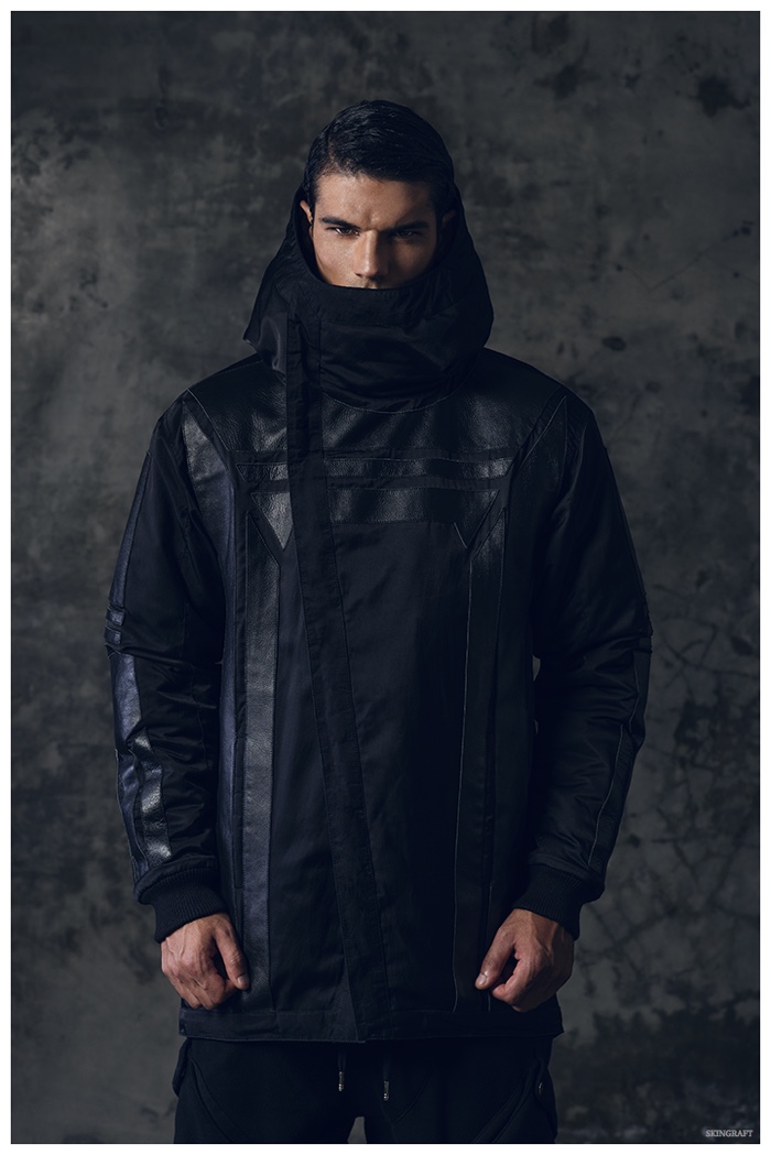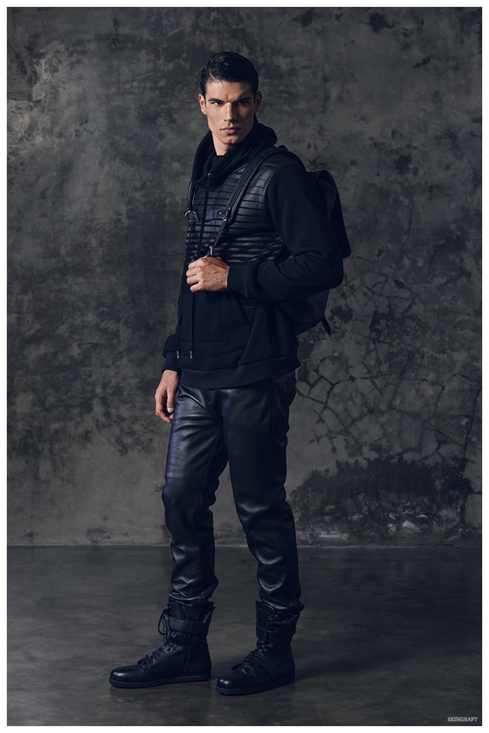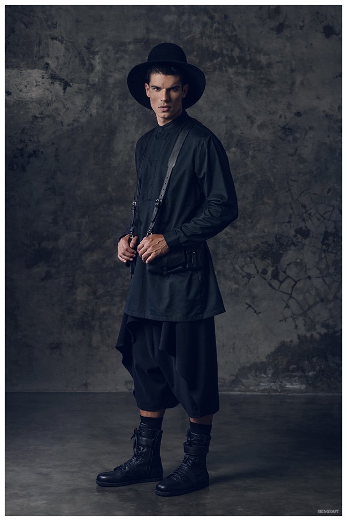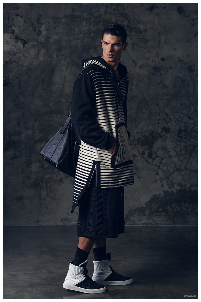 Skingraft prepares for its upcoming fall-winter 2015 show during New York Fashion Week. Unveiling a preview of the new collection, the label tapped photographer Wong Sim and stylist Angie Anggoro for an exclusive lookbook. Front and center, model Alexsandro Duarte da Costa sports strong ensembles from the upcoming range. Inspired by the idea of an urban trek through the Peruvian mountains, Skingraft creative director Jonny Cota explores complex geometric patterns and statue-like silhouettes, filtered through the label’s signature dark aesthetic.