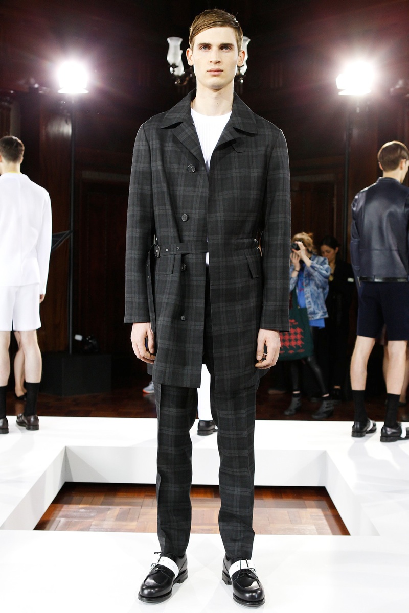 All About Tartan–Pringle of Scotland designer Massimo Nicosia took a simple approach to the label’s spring/summer 2014 collection, embracing tartan for the small showing. Focusing on tailored suiting finished with a lean cut and knitwear that played with the tartan in a modern context, Pringle of Scotland’s man was afforded a clean finish, accompanied by core staples.