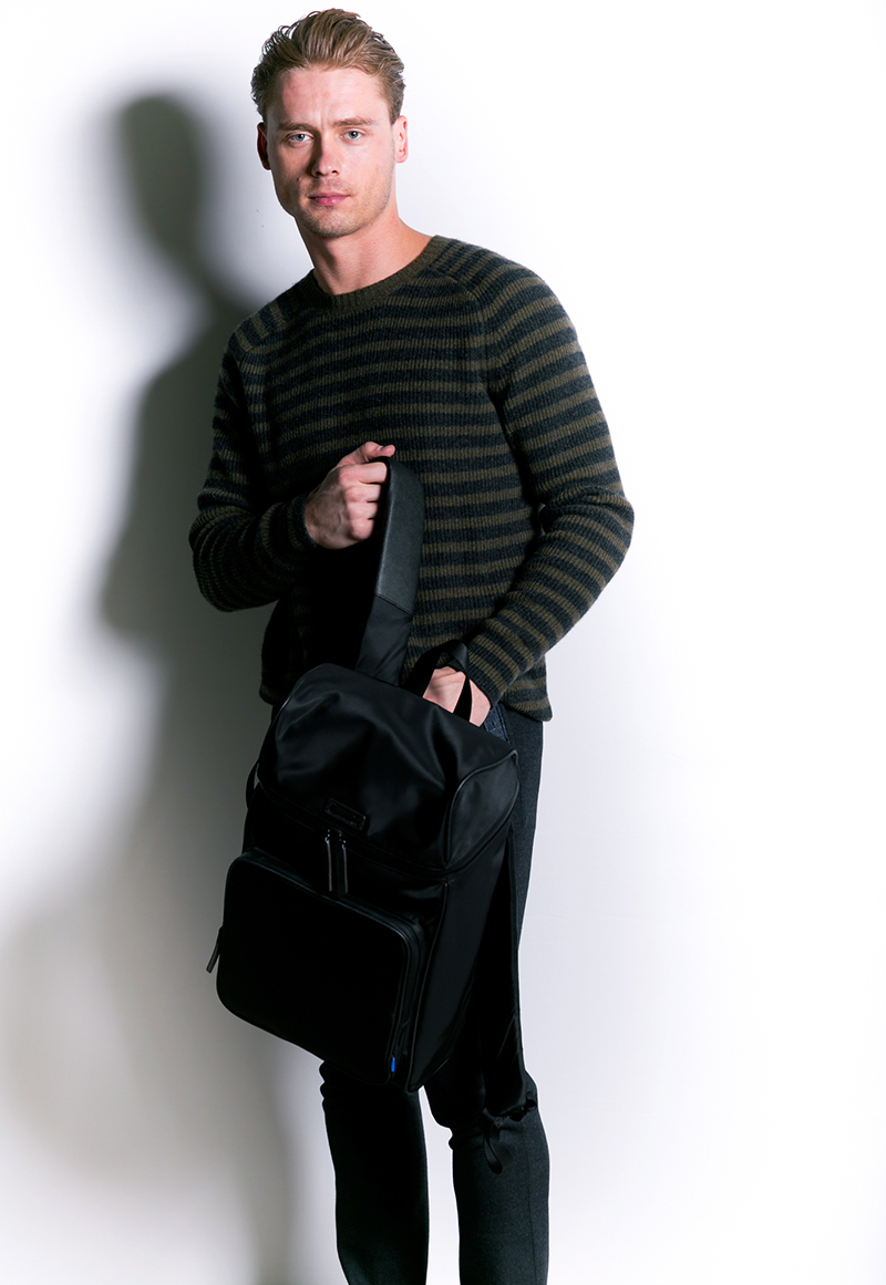 PinAndrew wears striped sweater Vince, pants Closed, and backpack Uri Minkoff.