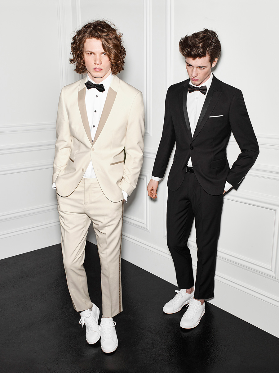 Simons makes a brilliant case for prom style with a guide lensed by Leda & St Jacques. Models Arran Turton-Phillips, Robbie Beeser and Matthew Davidson play dress-up for the occasion. Fresh prom ensembles are offered up with modern proportions and a splash of character. First and foremost, tuxedos are given a contemporary update with white sneakers.