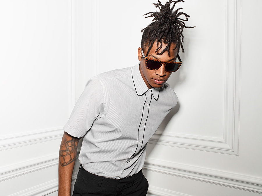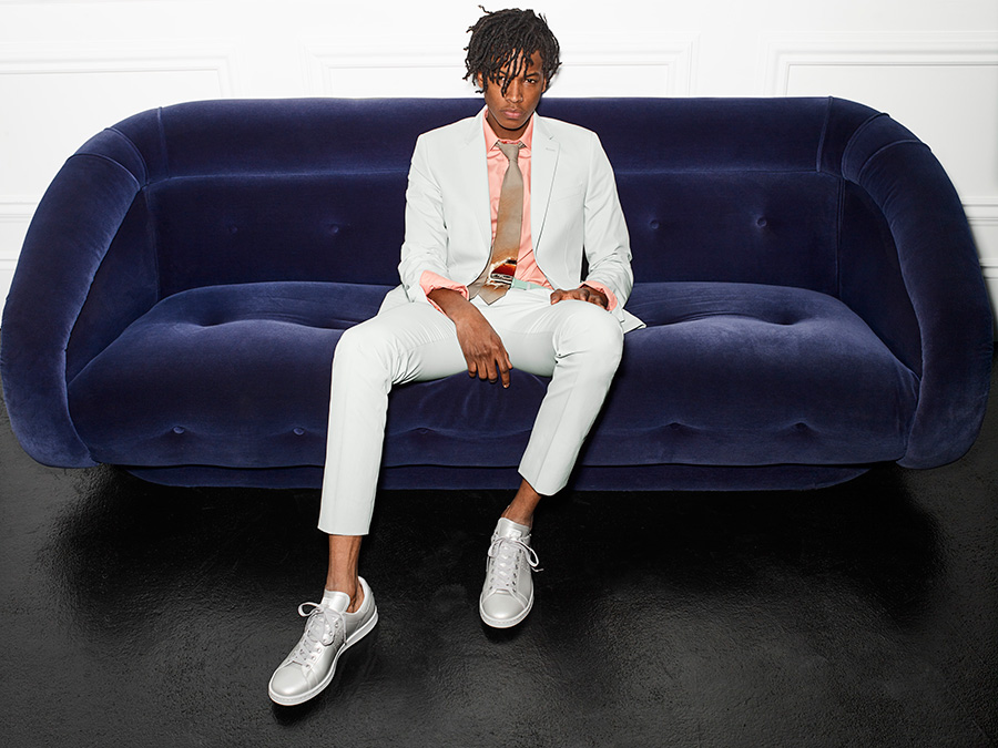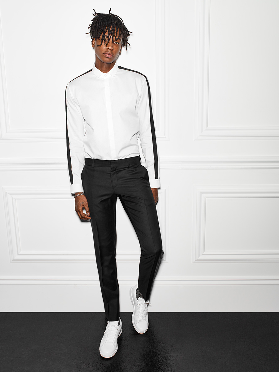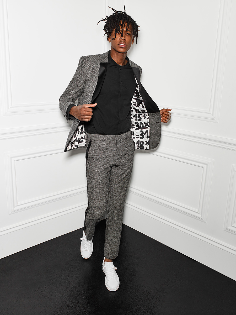 PinTexture Grab: Matthew Davidson models Le 31’s 2.0 tuxedo jacket with a black band collar shirt and white sneakers.