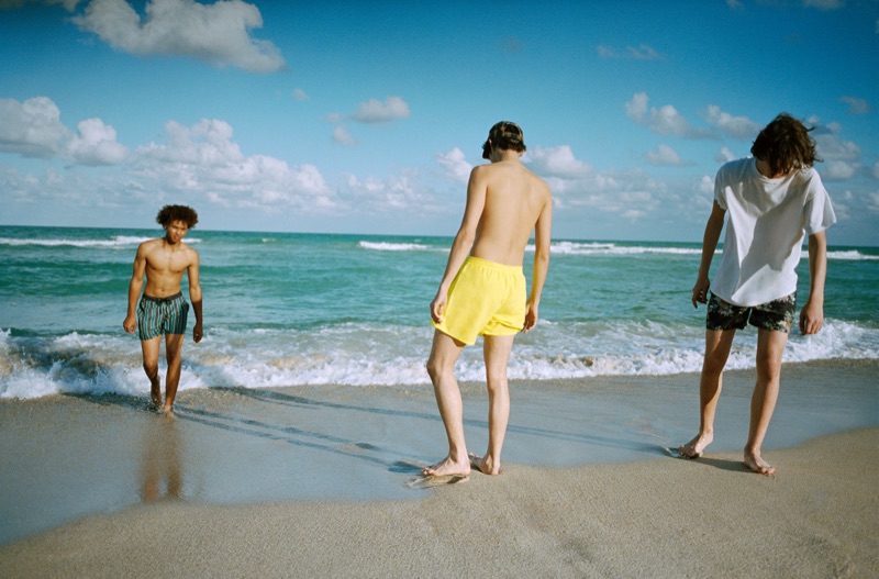 Niks Gerbasevskis, Miles Anderson, and Claude Morgan sport swimwear and printed shirts from Pull & Bear.