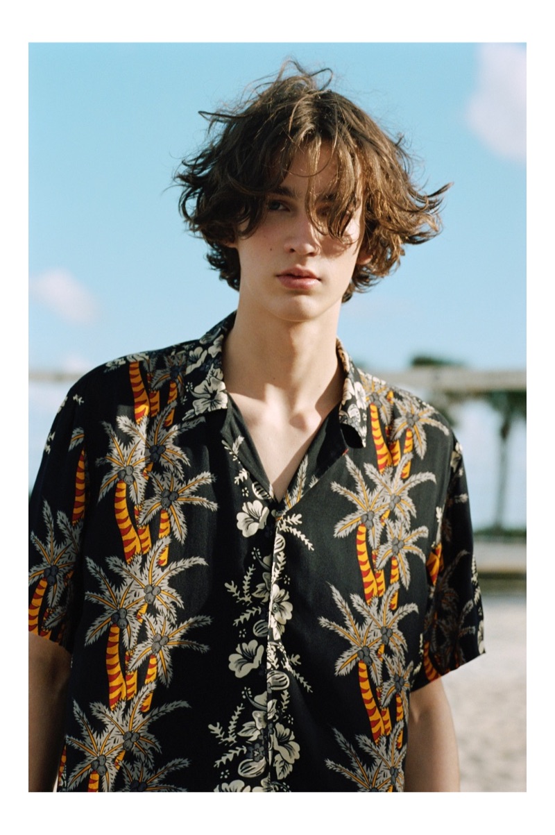Taking to the beach, Niks Gerbasevskis wears a yellow Hawaiian shirt by Pull & Bear.Pin
