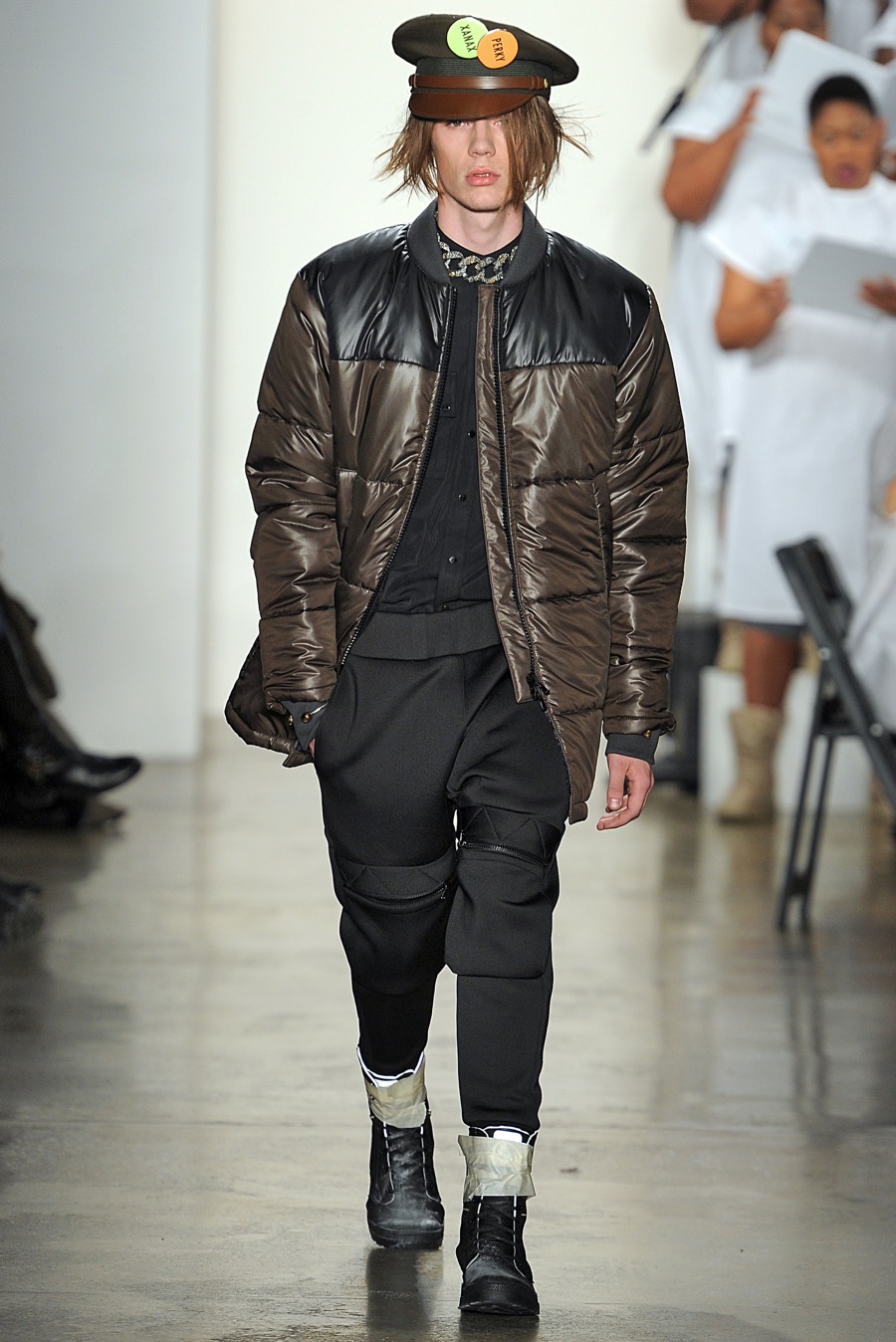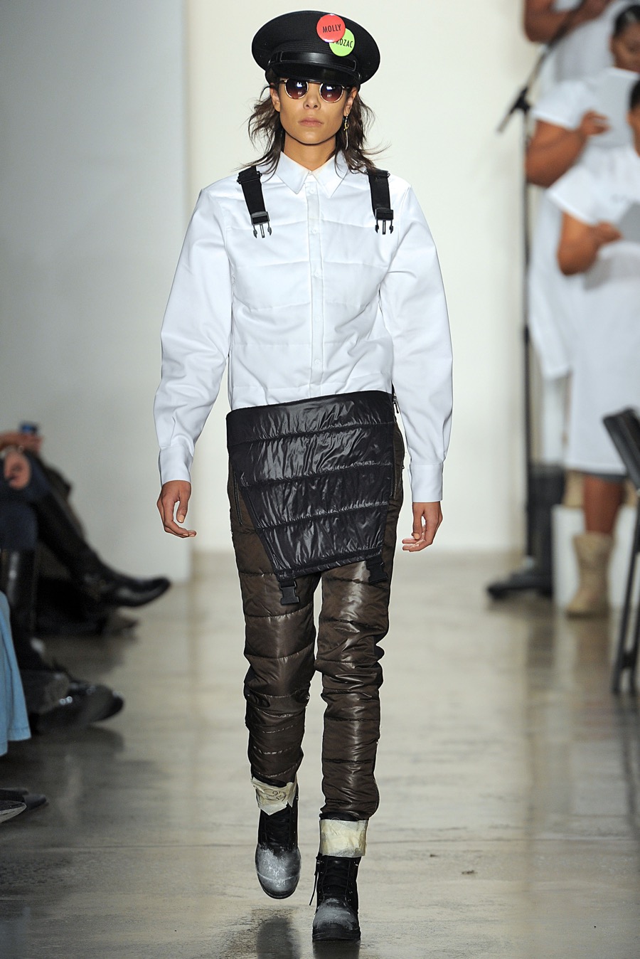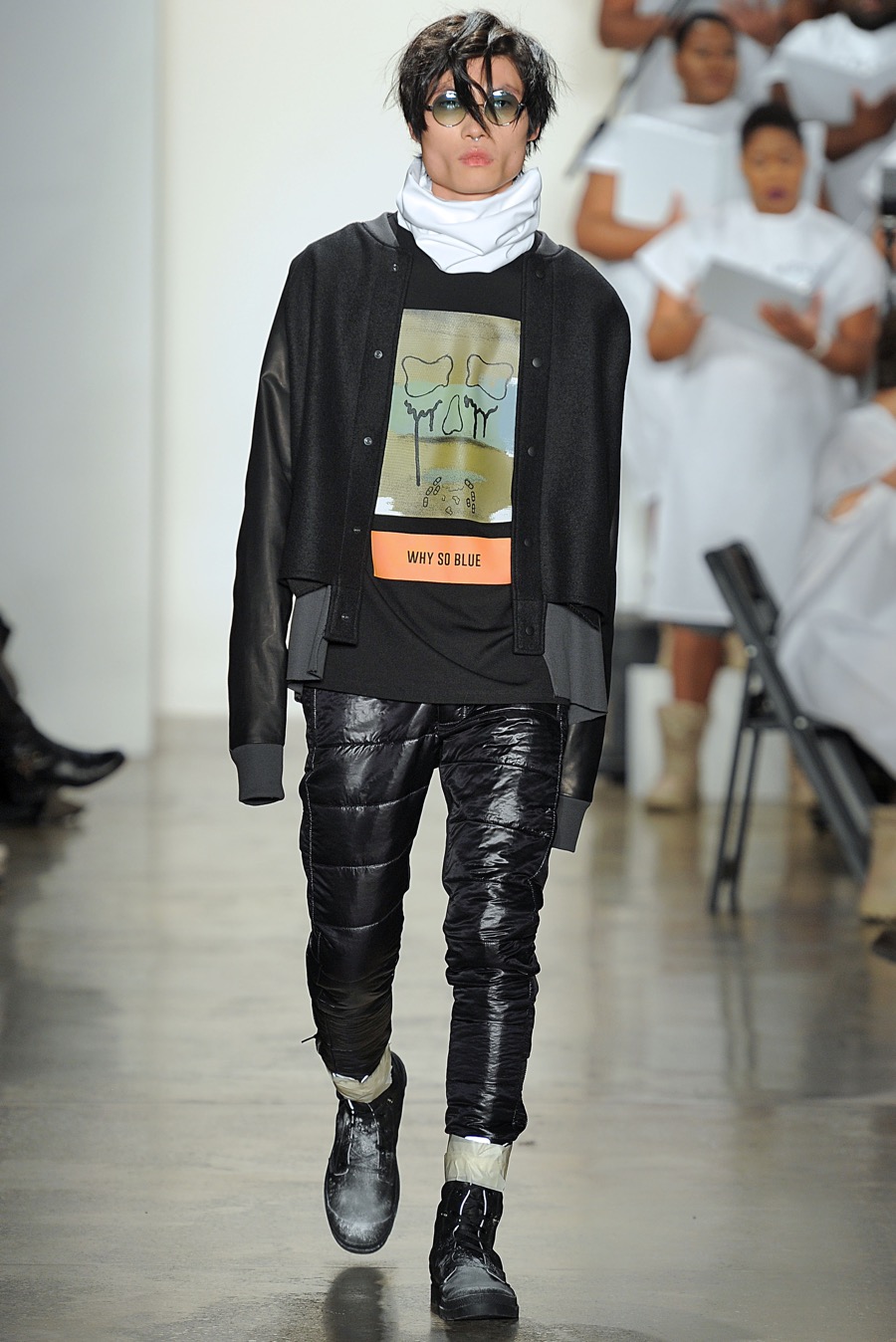 Starting at a simple point with joggers, graphic tops and robe-inspired outerwear featuring relaxed tailoring, the collection transitioned into a selection of quilted pieces. Alluding to padded rooms, refined quilting was reflected with pants, shirting and outerwear. Bringing star power to the outing, Erykah Badu styled the show, incorporating her own collection of accessories. Badu and Jean-Raymond also collaborated with jeweler Ugo Cacciatori for more collection pieces.