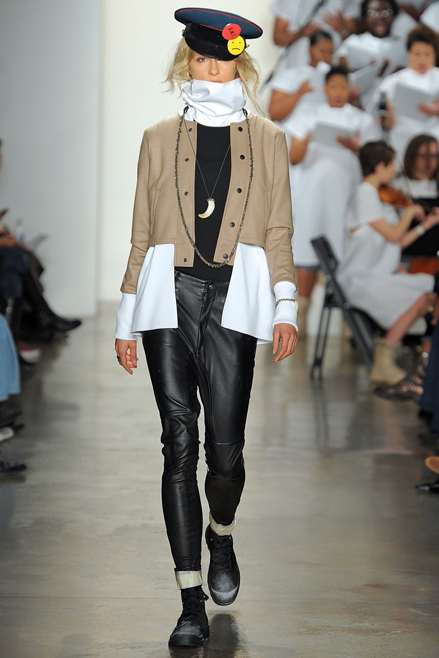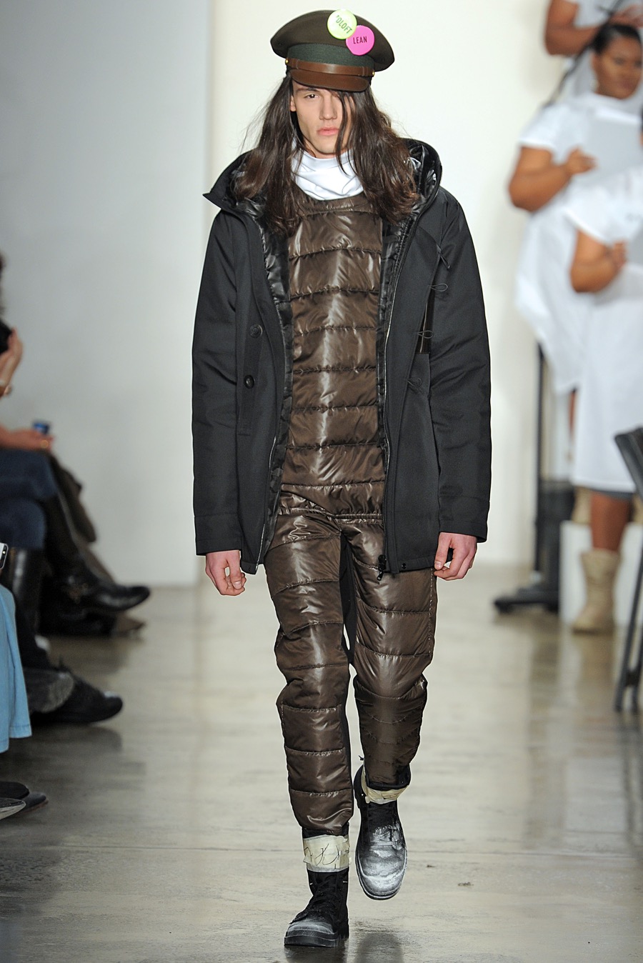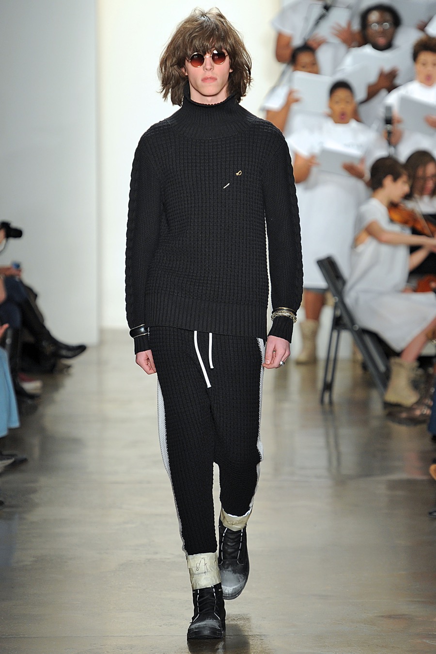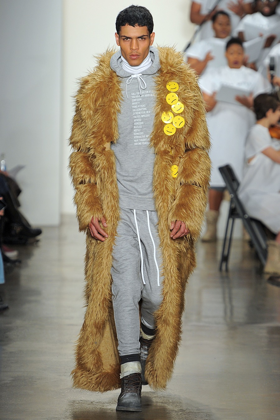 Starting at a simple point with joggers, graphic tops and robe-inspired outerwear featuring relaxed tailoring, the collection transitioned into a selection of quilted pieces. Alluding to padded rooms, refined quilting was reflected with pants, shirting and outerwear. Bringing star power to the outing, Erykah Badu styled the show, incorporating her own collection of accessories. Badu and Jean-Raymond also collaborated with jeweler Ugo Cacciatori for more collection pieces.