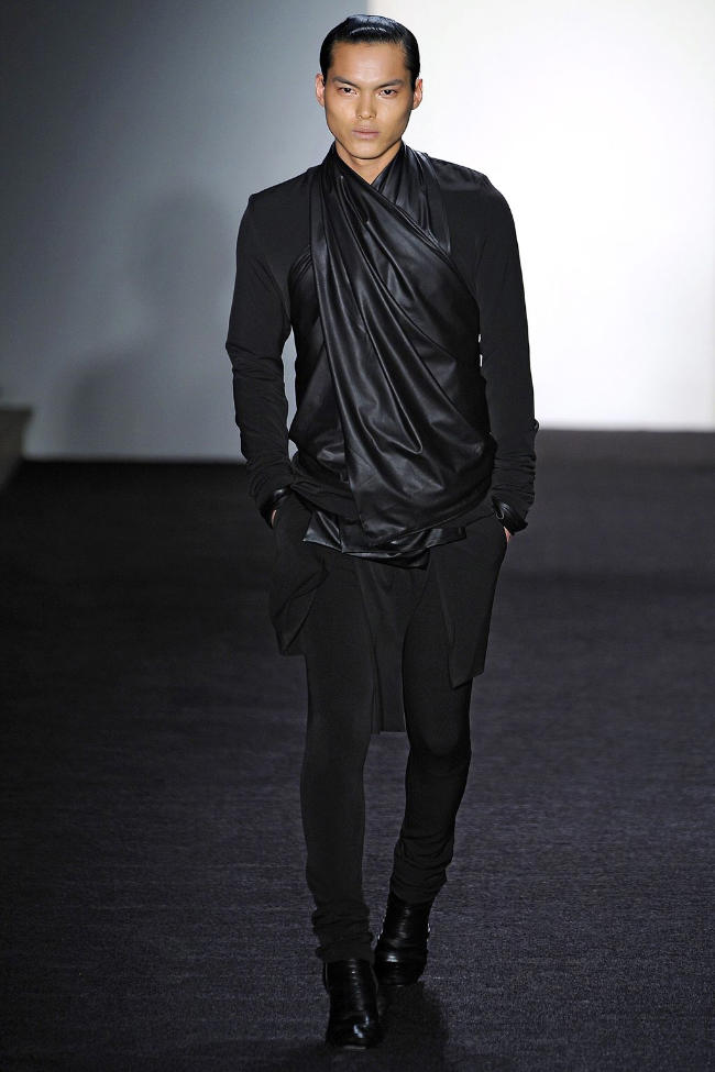 The wardrobe of Rad by Rad Hourani’s bold modern man gets added length for the fall season. Elongating the body, but still showcasing a form conscious vision, a tight cohesive round of looks are layered with care. Embracing light foundational garments and adding volume in the outerwear category, Hourani’s man is a sight to be seen in his signature heels and spectrum of strictly black.