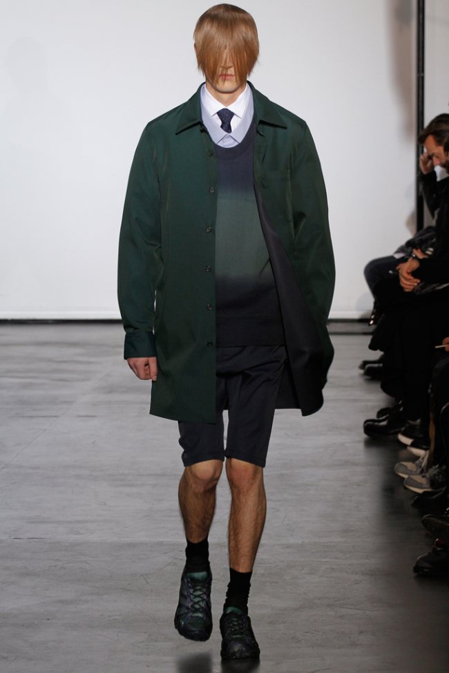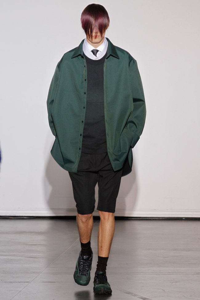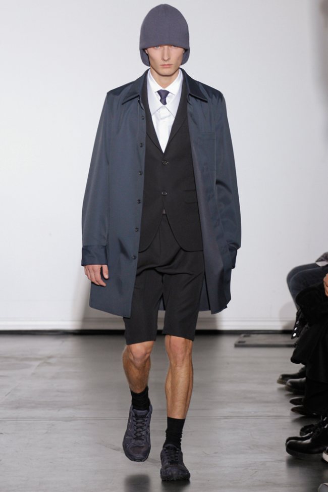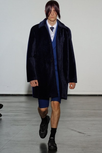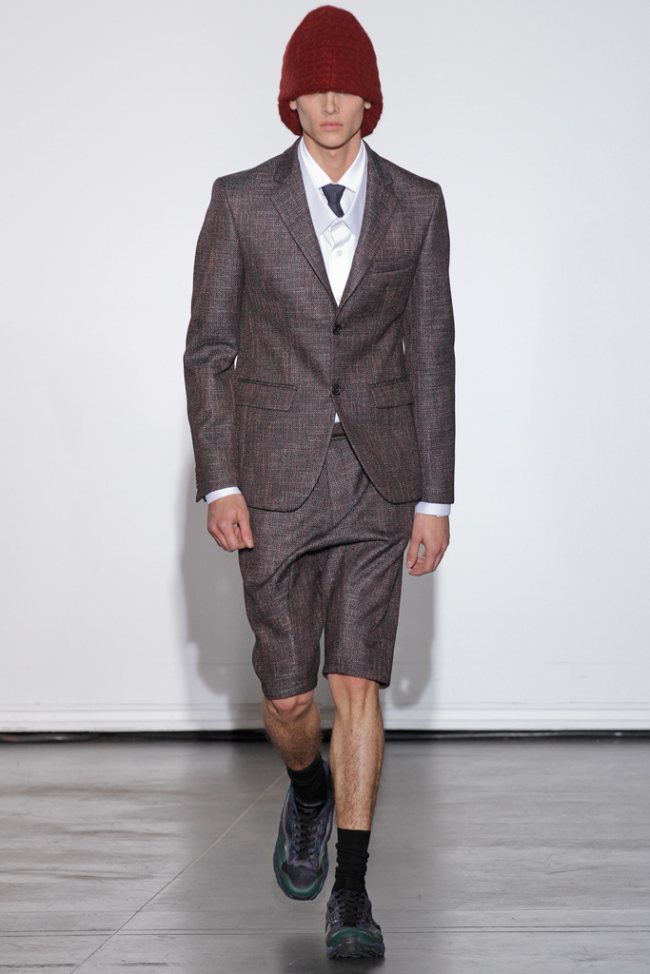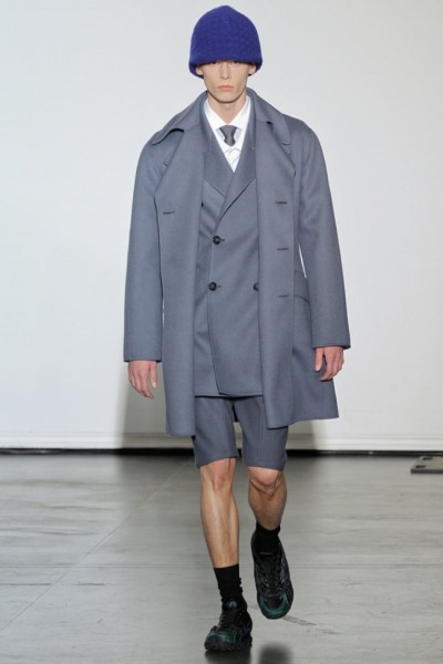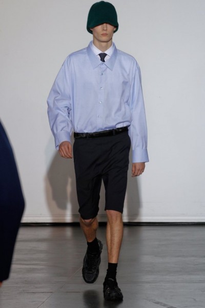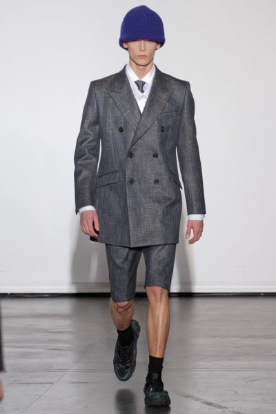 Modern Youth Movement-Rebelling against the season, Raf Simons sent his men down the catwalk in shorts. With hair swept in faces and oversized hats, the classic suiting that has hit many a runway this season was turned on its side for a look decisively Simons. The double-breasted jacket, cut in charcoal felt delightfully casual. Mastering proportions, shirting cut larger made the unexpected layering piece to a tie and shirt combo. Working in mesh knits and tops, dressed in gradients, the Belgian designer created a collection of youth and ease, making for a delightful fall showing.
