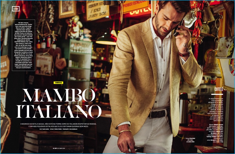 The Brazilian model channels the ease and sophisticated of Italian style with a smart wardrobe. Gabi Comis serves as fashion editor for the outing, calling attention to choice brands such as Hugo Boss, Salvatore Ferragamo, and Tommy Hilfiger. Rafael also wears accessories from his own label, Liberty Art Brothers. / Art by Rafael Pera. Grooming by Liege Wisniewski.