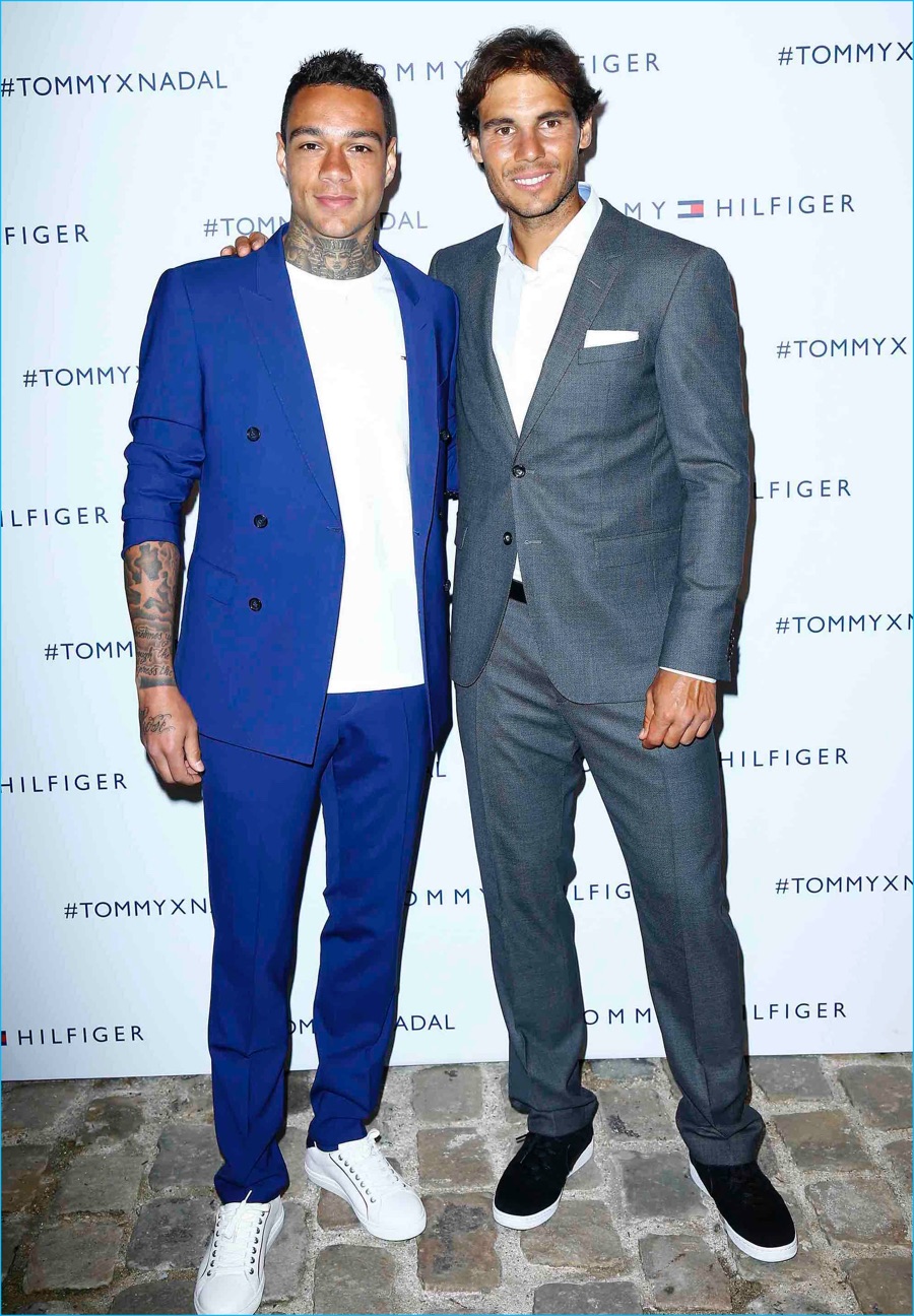 Hilfiger continues, “Rafael really exemplifies our brand spirit: fun, cool, and never too serious. We’re excited to bring our ‘tennis with a twist’ event to Paris, and share the playful concept with our fans in the city.” Also bringing style to the event, Nadal and van der Wiel donned suits from the limited-edition THFLEX Rafael Nadal Edition capsule collection. Spanish model Andres Velencoso Segura was on-hand as well, wearing a sharp grey single-breasted suit.