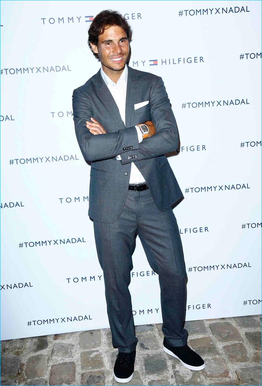 Rafael Nadal dons grey suiting as he poses for pictures at Tommy Hilfiger’s pop-up tennis tournament.