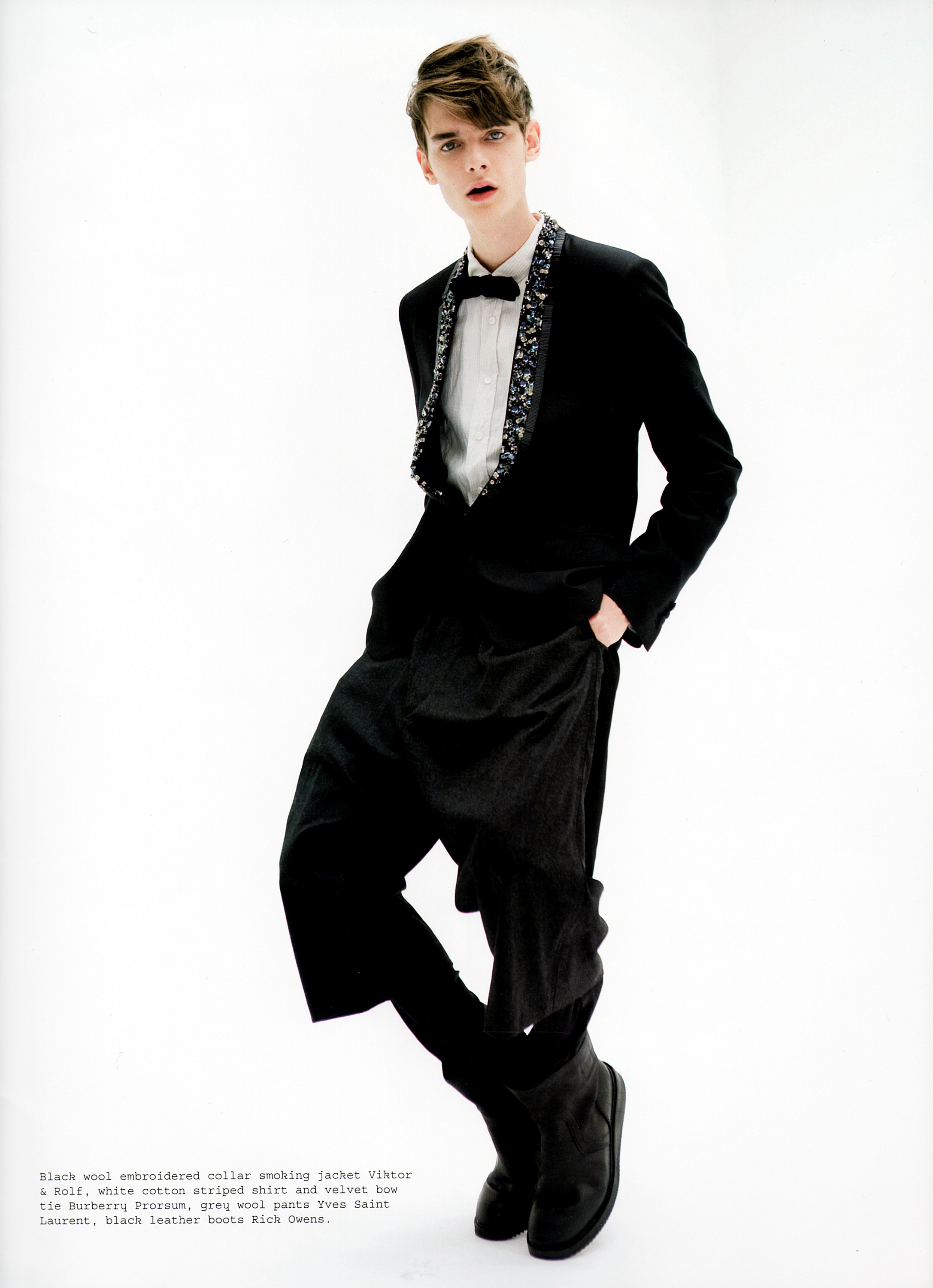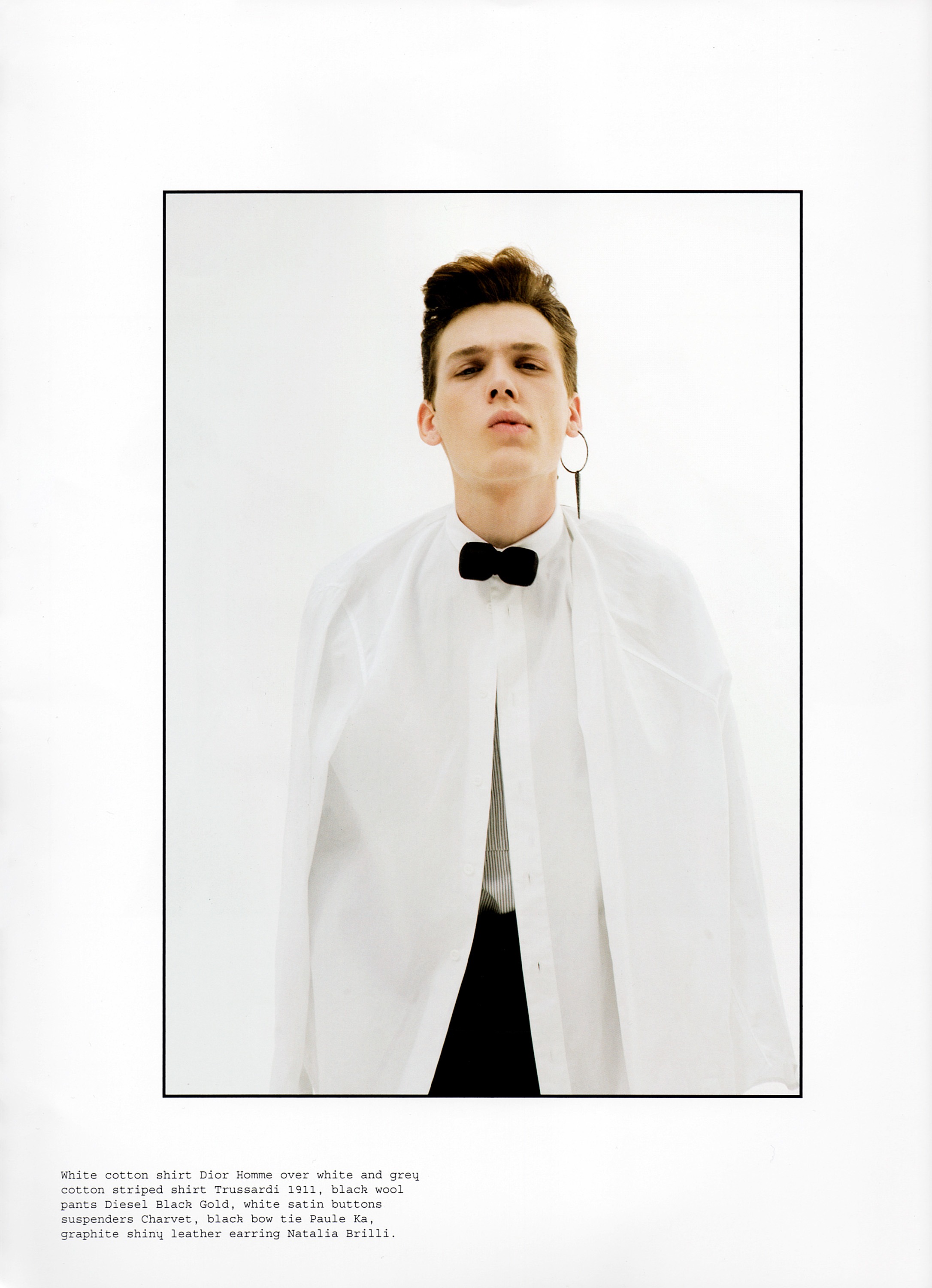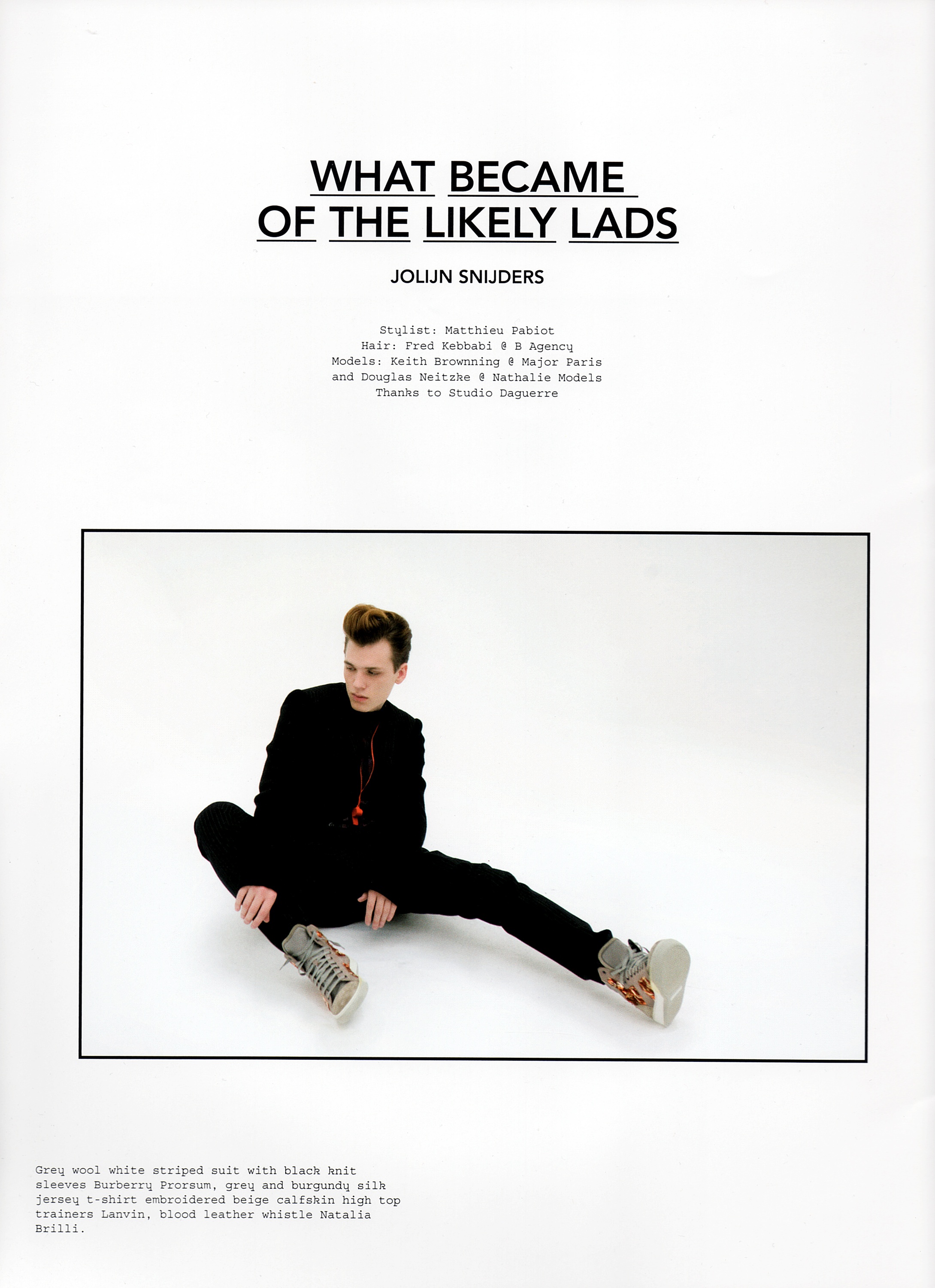 Connecting with photographer Jolijn Snijders in 2009 for the seventeenth issue of Spanish magazine Metal, models Douglas Neitzke and Keith Browning brought a quirky energy to the photo studio. Styled by Matthieu Pabiot in formal fashions with a twist, Douglas and Keith showed a rebellious attitude, mixing traditional staples with then current it pieces.