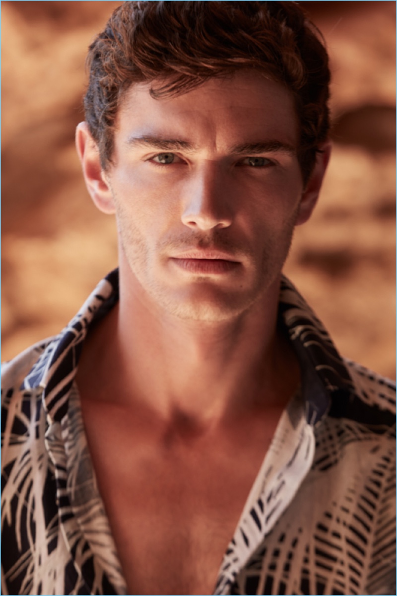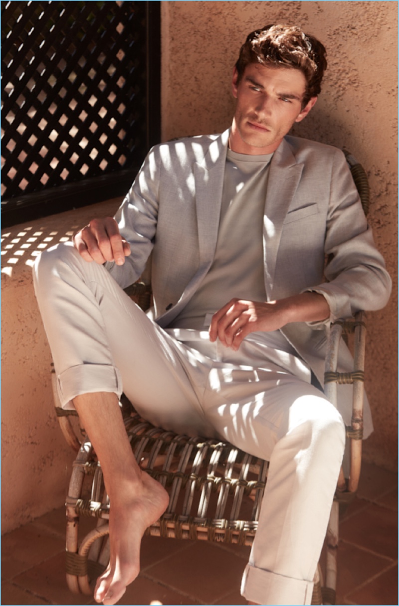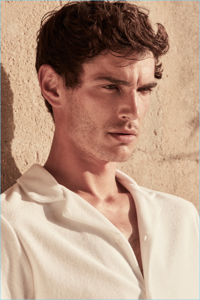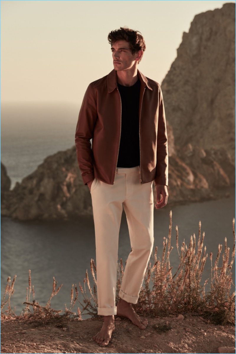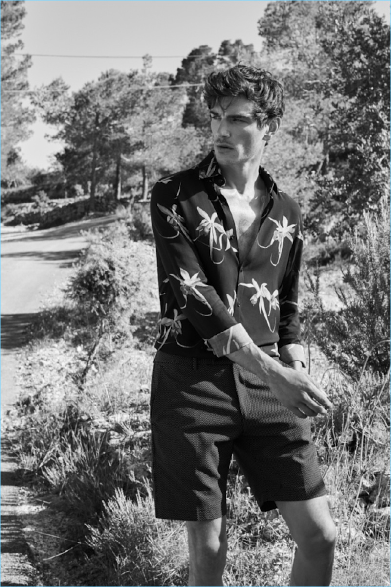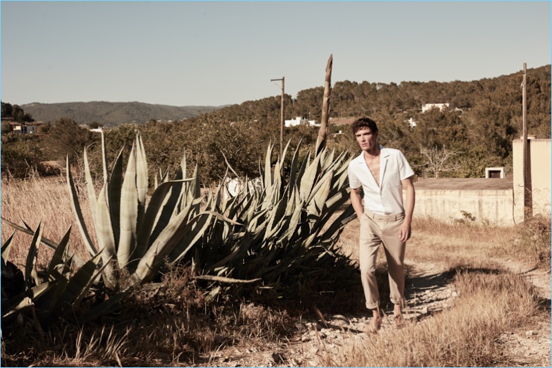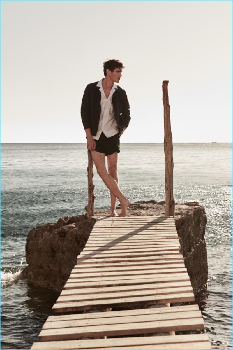 Reiss reunites with Julien Sabaud for its high summer 2017 outing. The French model travels to Ibiza for a picture-perfect vacation. Wearing on-trend pieces such as a Cuban collared shirt, Julien appears before the lens of photographer Barry Craske. Collaborating with Craske, stylist Dominic Sherear pulls together an impressive wardrobe. Reiss’ smart signatures reign with pink suiting, printed shirts, slim-fit chinos, and more. / Grooming by Terri Capon (Stella Creatives).