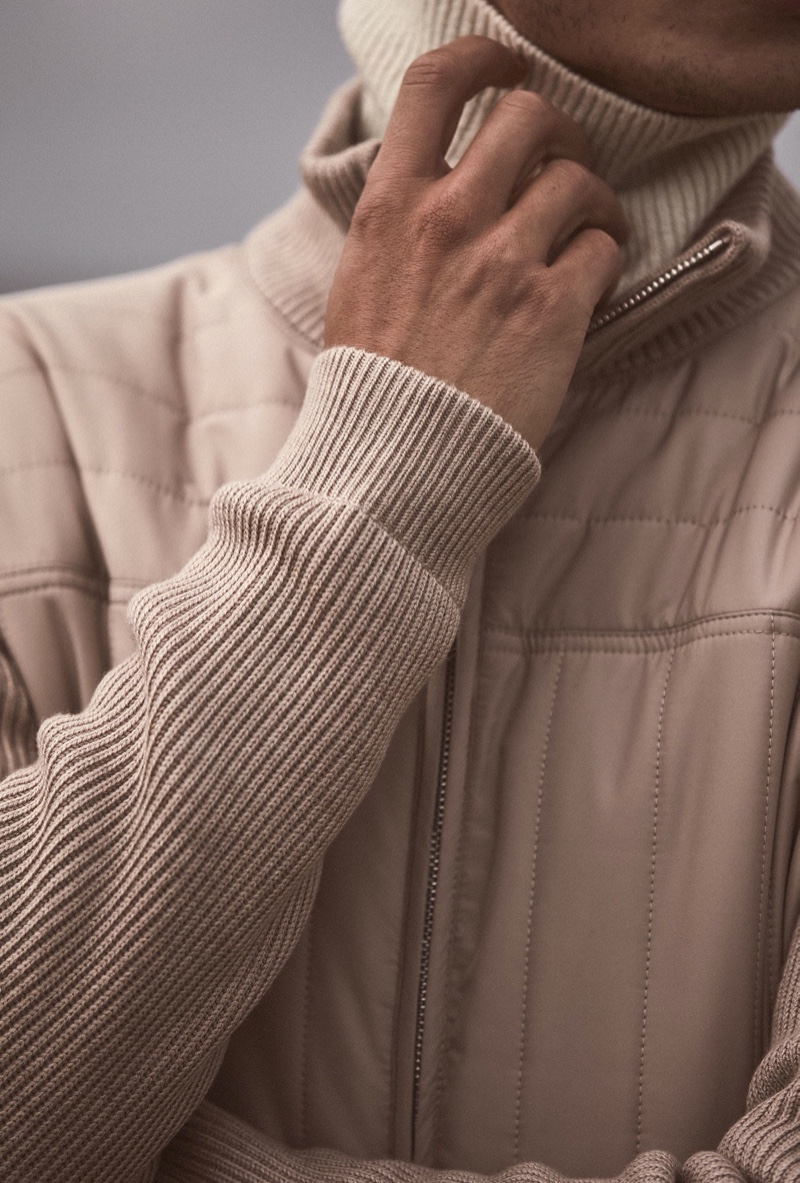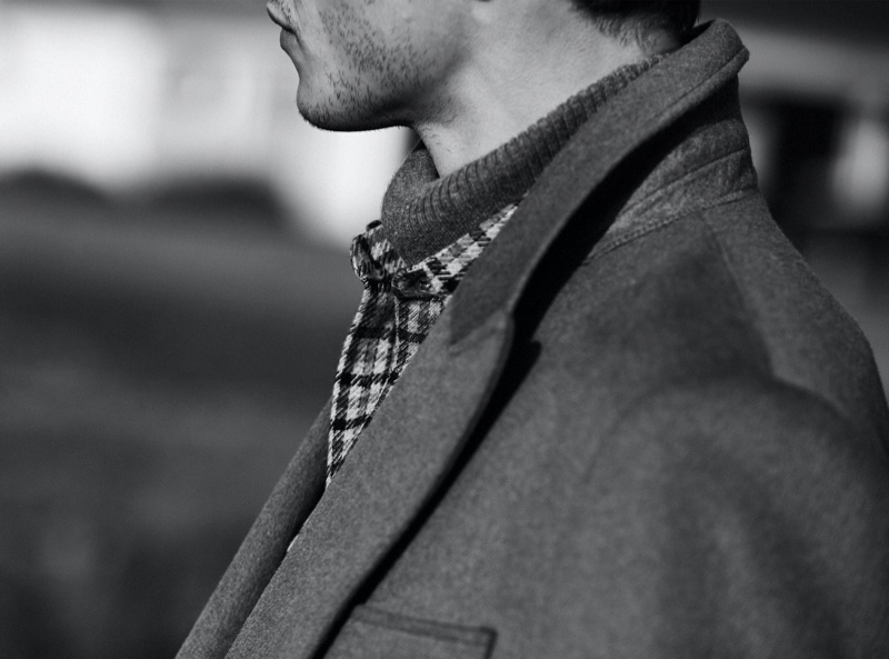 as Reiss showcases its covetable styles. Monochromatic looks are front and center to complement an effortless color palette of neutrals. Posing for gorgeous photos, Adrien wears sophisticated outerwear styles such as Reiss’ Milton wool-blend double-breasted camel coat and Quentin quilted zip through jacket.