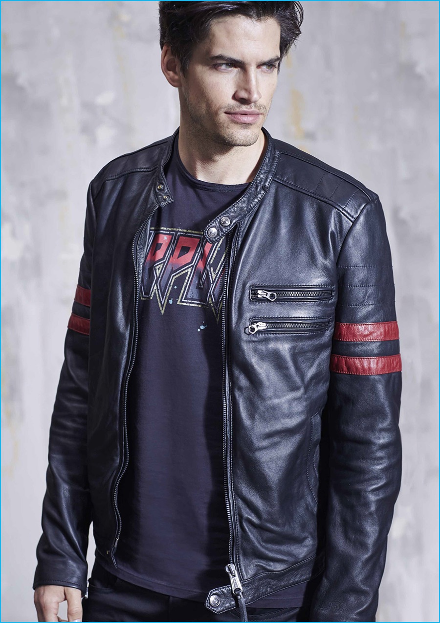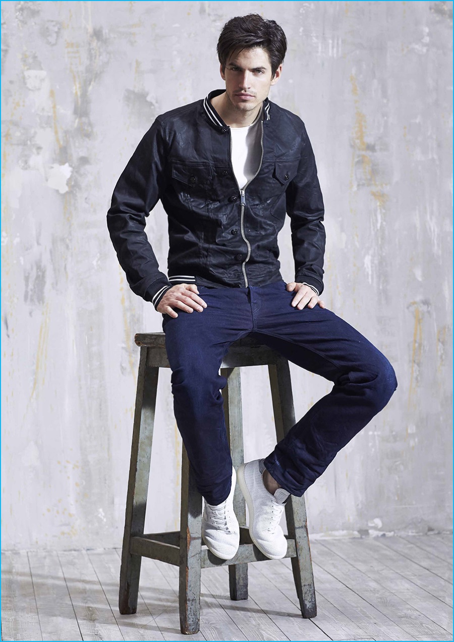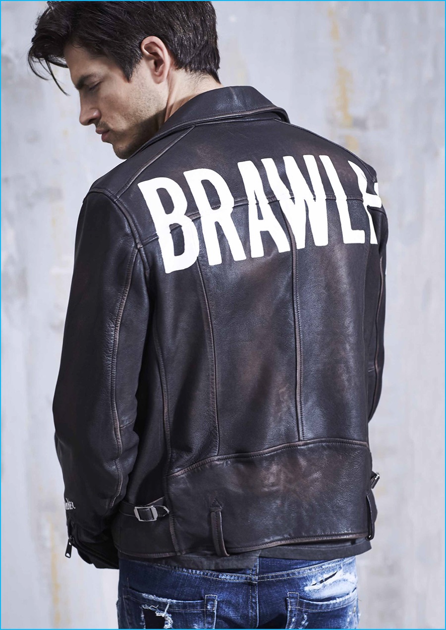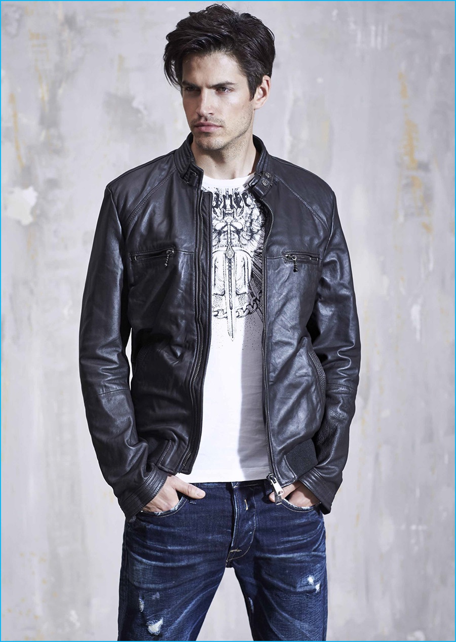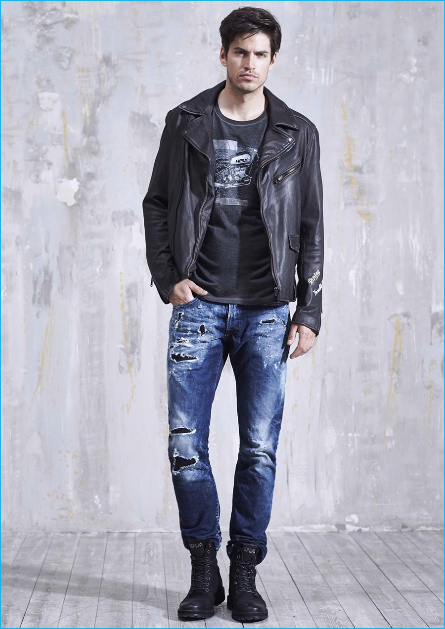 Italian fashion brand Replay celebrates its 35th anniversary with its fall-winter 2016 men’s collection. Revisiting its heritage, denim and leather steal the season. Juxtaposed with deconstructed tailoring, Replay offers a contemporary take on its biker roots. Sporty and military style references also invade the collection with bomber jackets, camouflage prints and more. Embracing a vintage feel, Replay champions a subdued color palette. The smart selection of colors enhances low-crotch chinos, microprint shirts, graphic tees and long-haired alpaca knitwear.