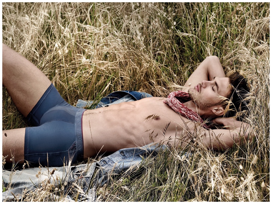 Relaxing in a field, Jabel Balbuena is comfortable in blue Replay underwear.Pin
