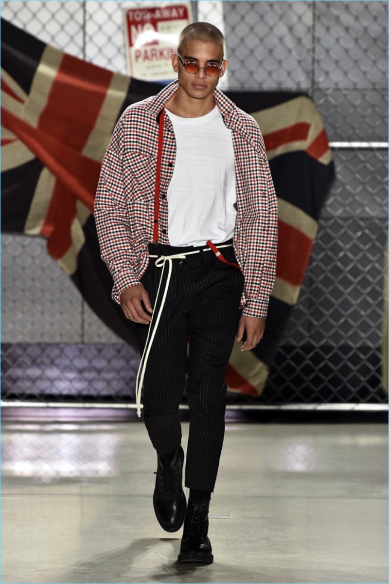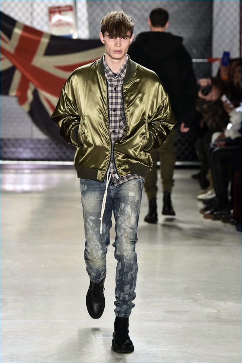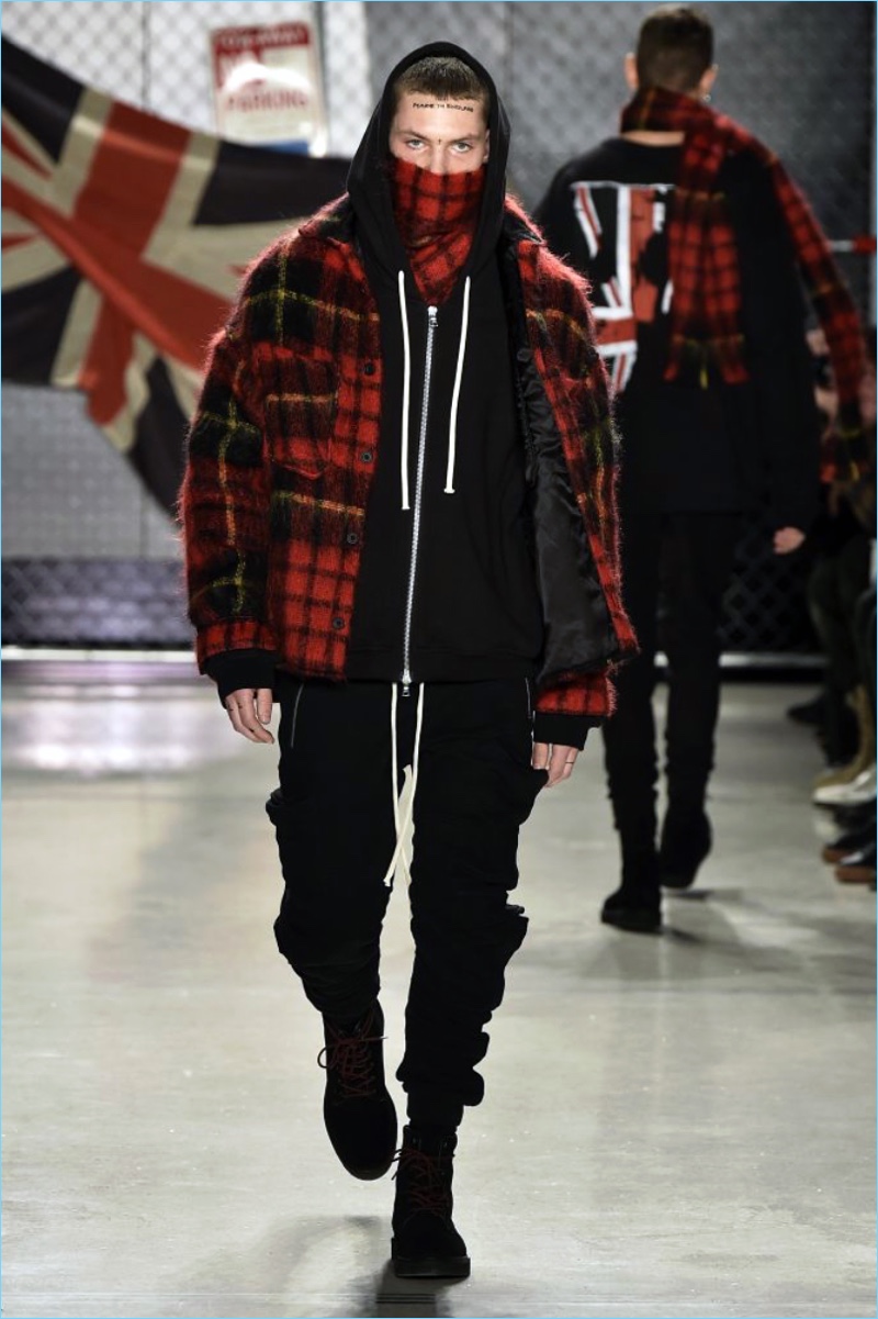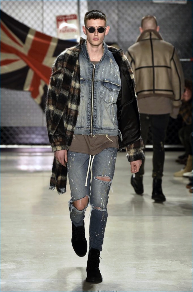Raf Simons wasn’t the only foreign brand to invade New York Fashion Week: Men. UK-based label Represent also took to the Big Apple to unveil its fall-winter 2017 collection. Brother designers, George and Mike Heaton look to their upbringing in Northern England as the initial inspiration for the season. Tartan prints and ripped denim help define the outing.