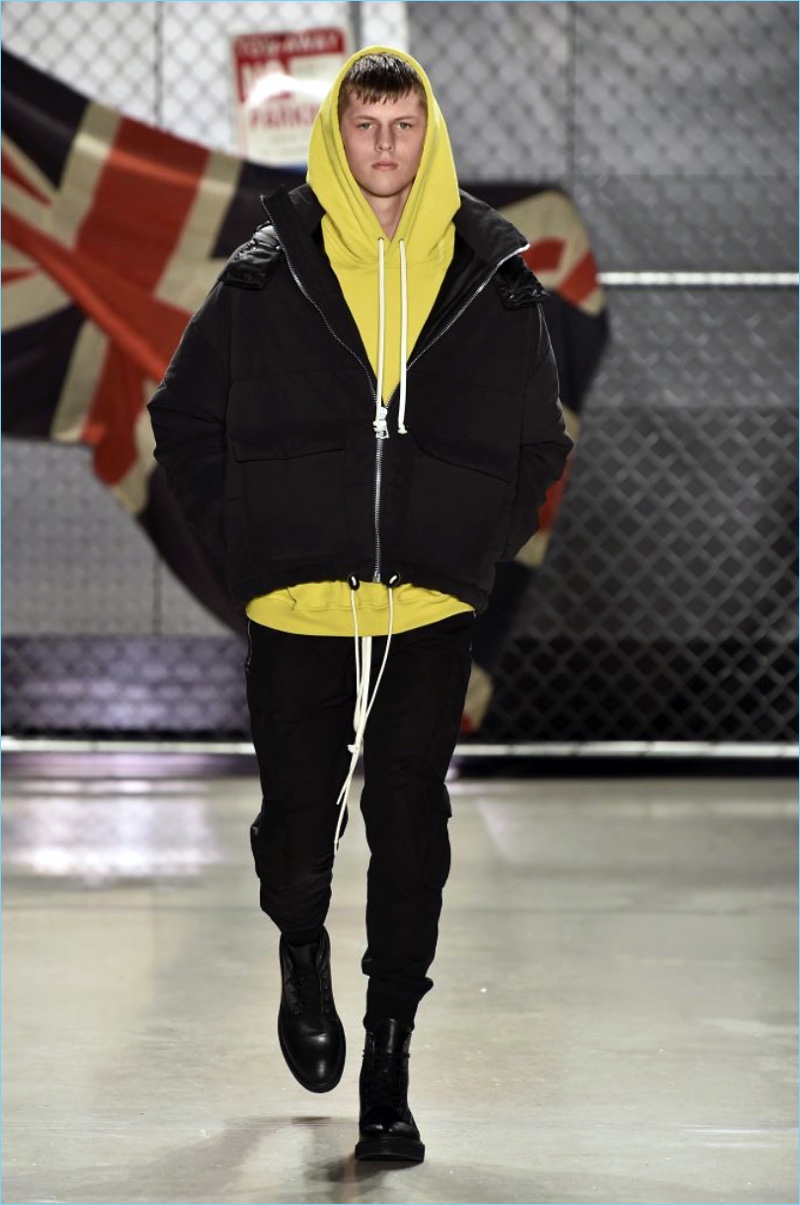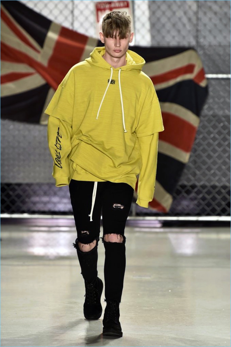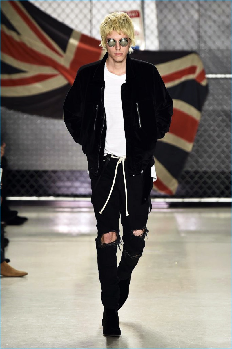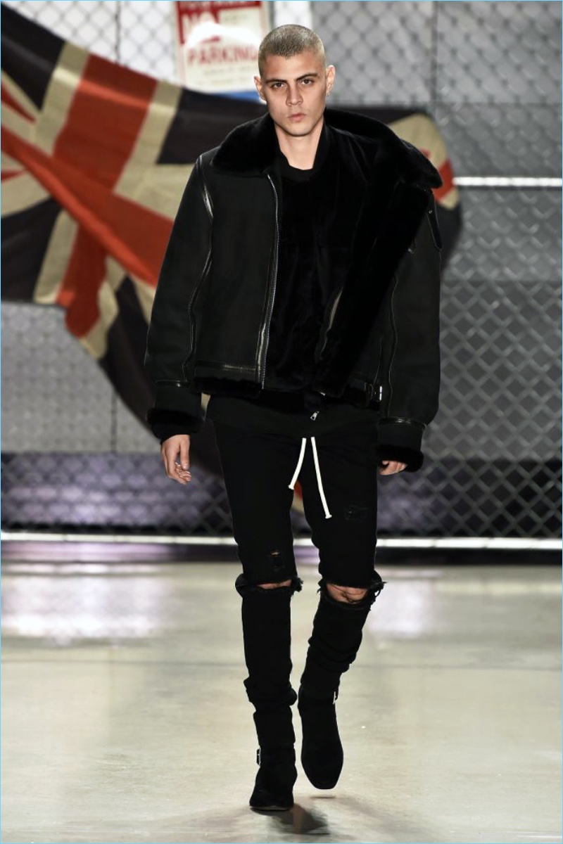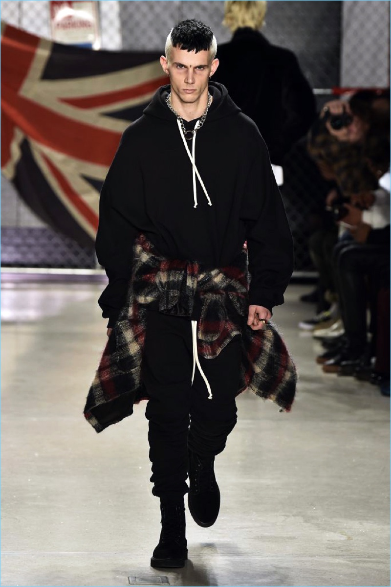 Raf Simons wasn’t the only foreign brand to invade New York Fashion Week: Men. UK-based label Represent also took to the Big Apple to unveil its fall-winter 2017 collection. Brother designers, George and Mike Heaton look to their upbringing in Northern England as the initial inspiration for the season. Tartan prints and ripped denim help define the outing.