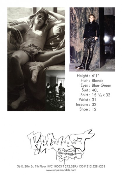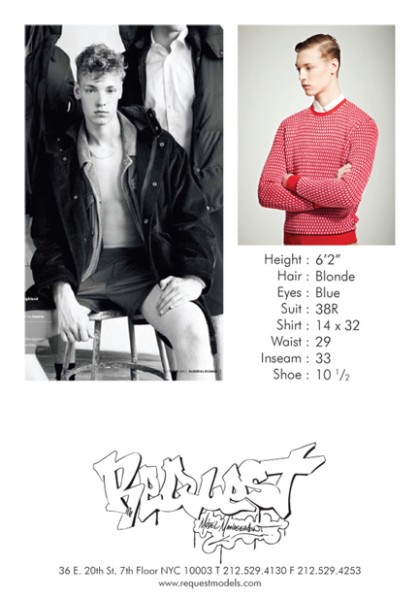 Request–Turning to photographer Stefani Pappas once more to capture the creative for this season’s show package, Request lends their boys a little edge with a subway shoot – not that they need it. With regular bad boys Yuri Pleskun and Cole Mohr available for the fashionable plunge, Request keeps their board in top shape. There’s the always popular David Agbodji, the strapping Arthur Kulkov as well as standout up and comers, ranging from Misa Patinszki to Baptiste Radufe. Add to the mix, a fast-rising Jesse Shannon or recent Request recruit Willy Cartier and you have an agency packing solid muscle, the fashion variety if course.