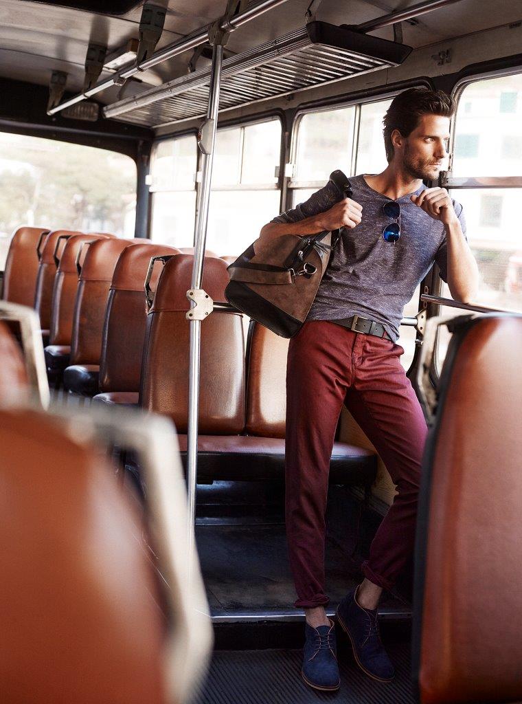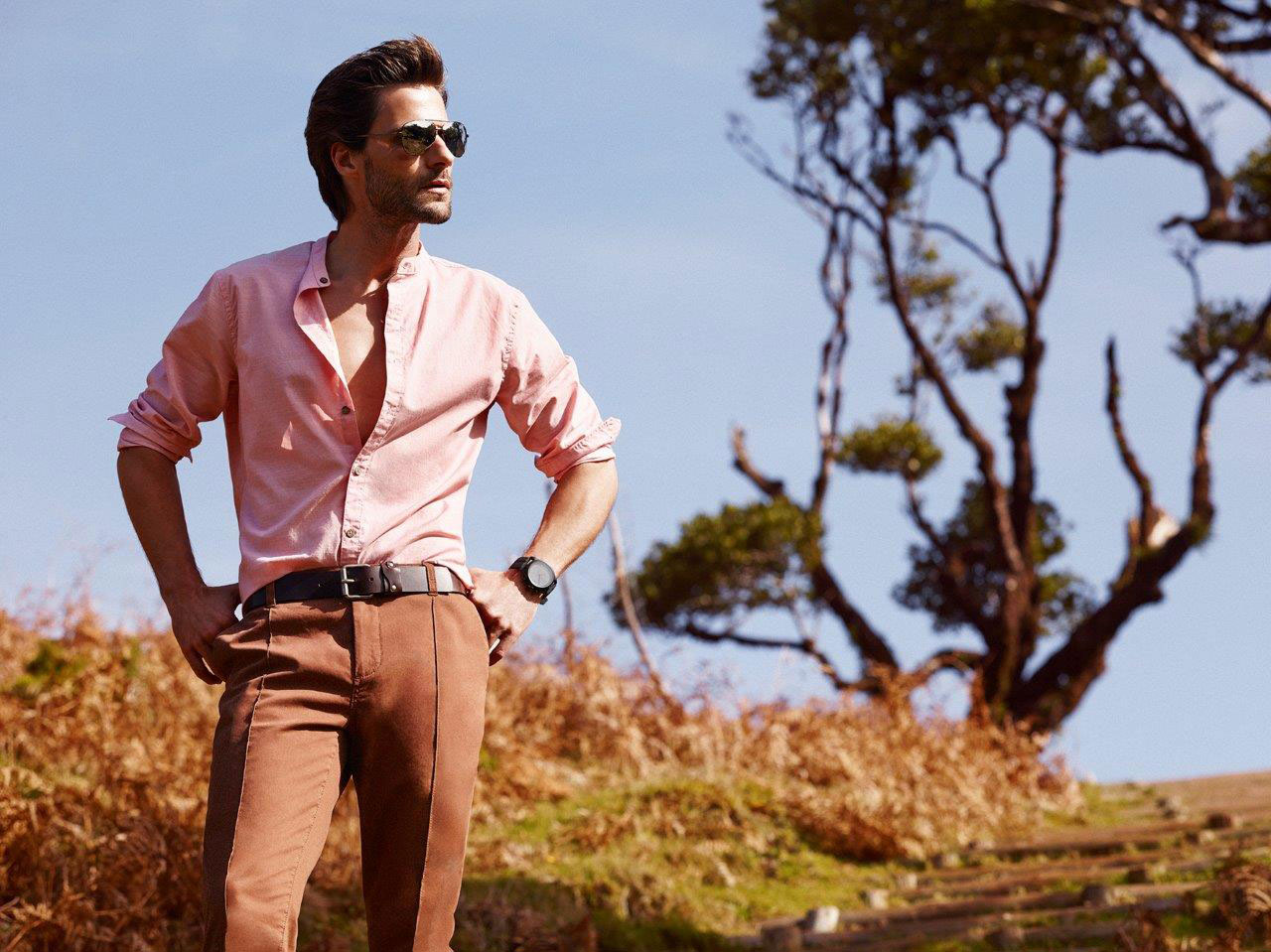 Tommy Dunn is a chic vision in a pink band collar shirt and brown pleated trousers for Reserved’s spring-summer 2016 campaign.