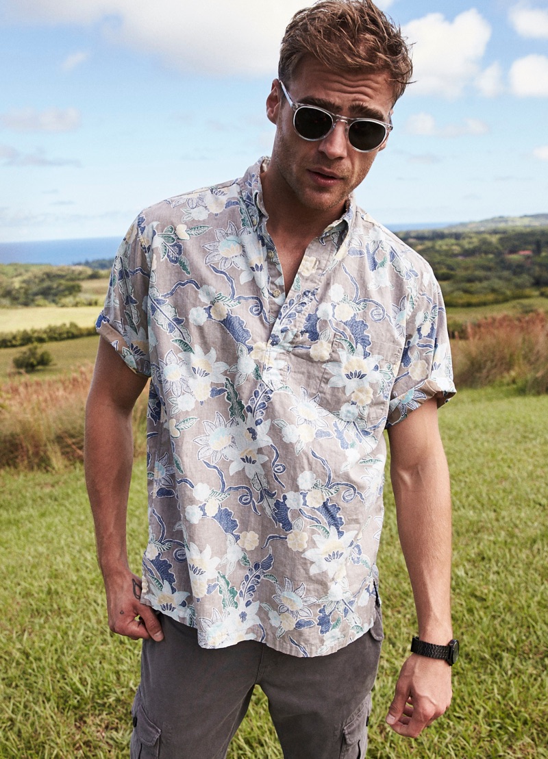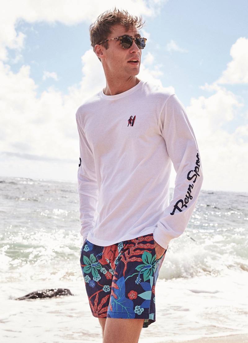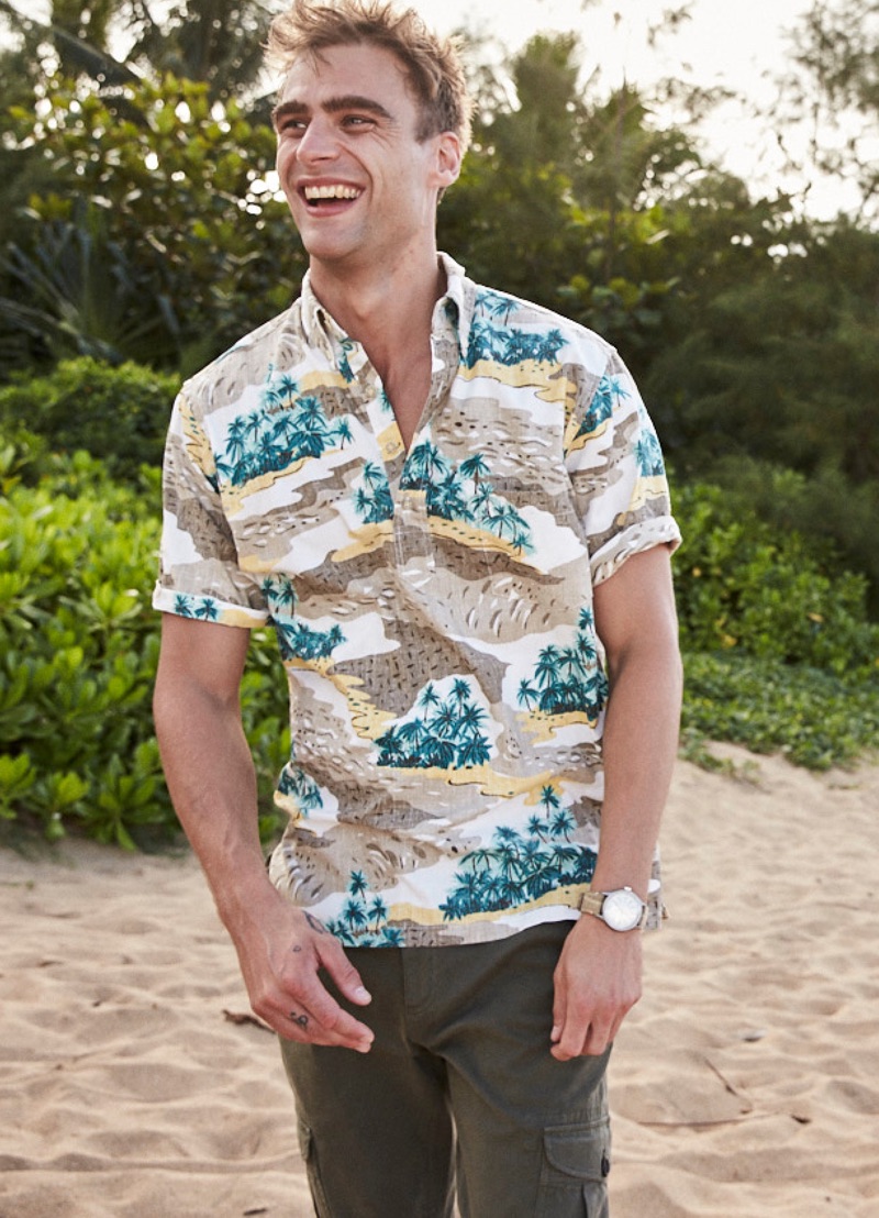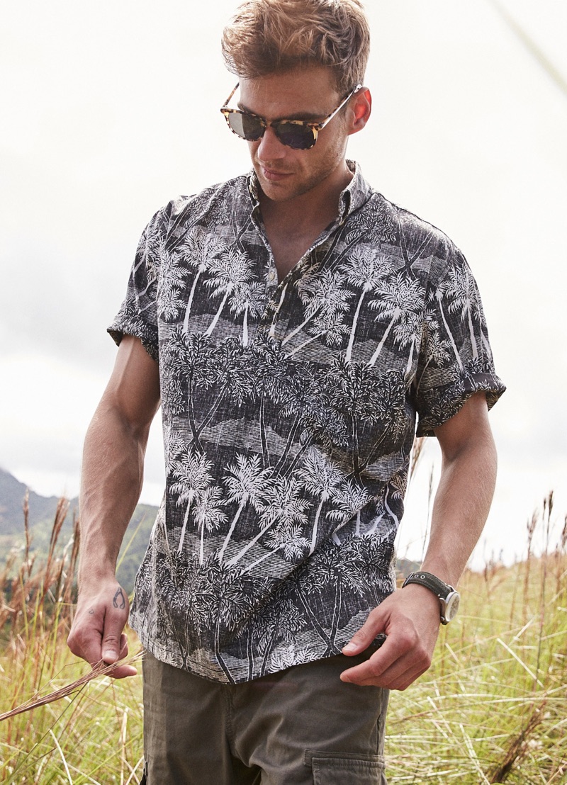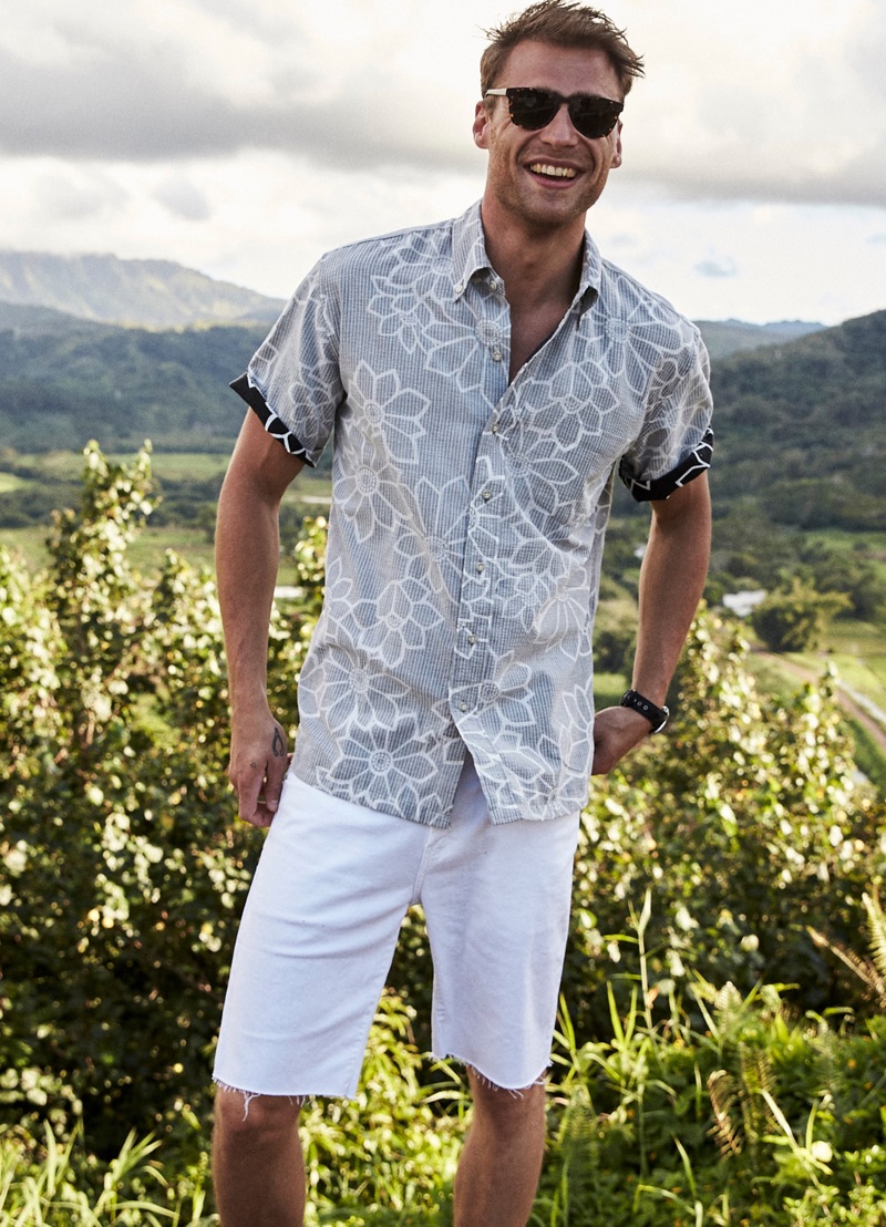 George Alsford is in a joyous mood as he embarks on a spring-summer 2019 journey with Reyn Spooner. The British model heads to Hanalei Valley Lookout in Kaui County, Hawaii for the season’s lookbook. Coliena Rentmeester photographs George, while Micah Johnson handles styling. Front and center, George wears designs from Reyn Spooner’s newly appointed creative director Doug Burkman. The lineup includes the label’s signature aloha shirts as well as graphic t-shirts and swimwear.