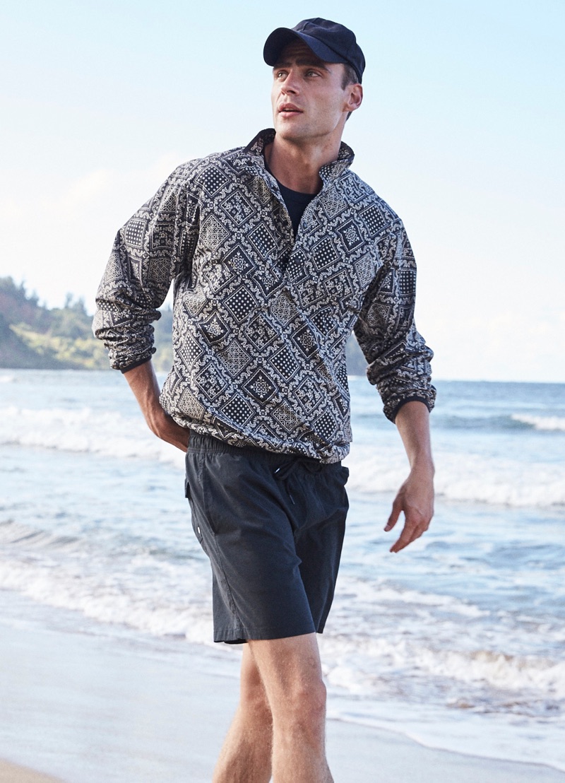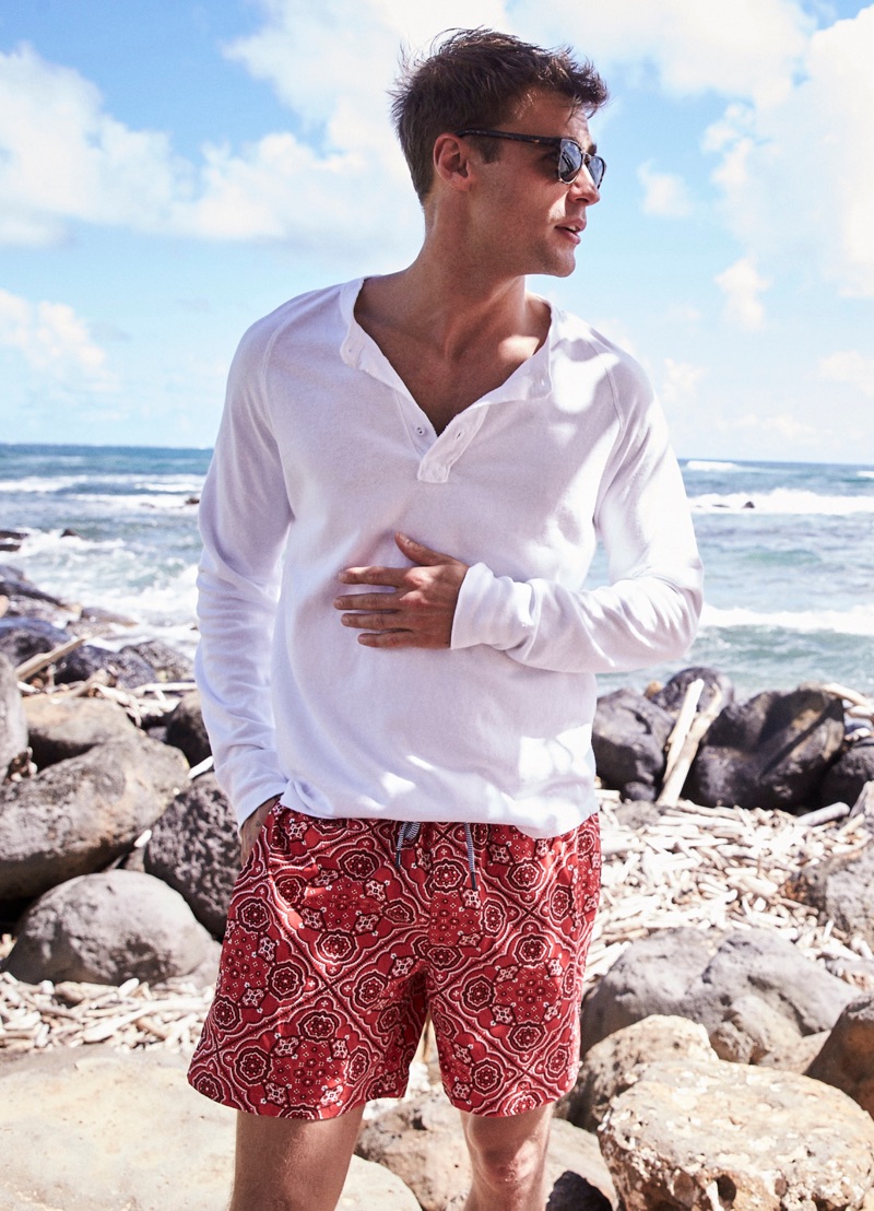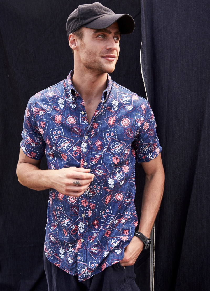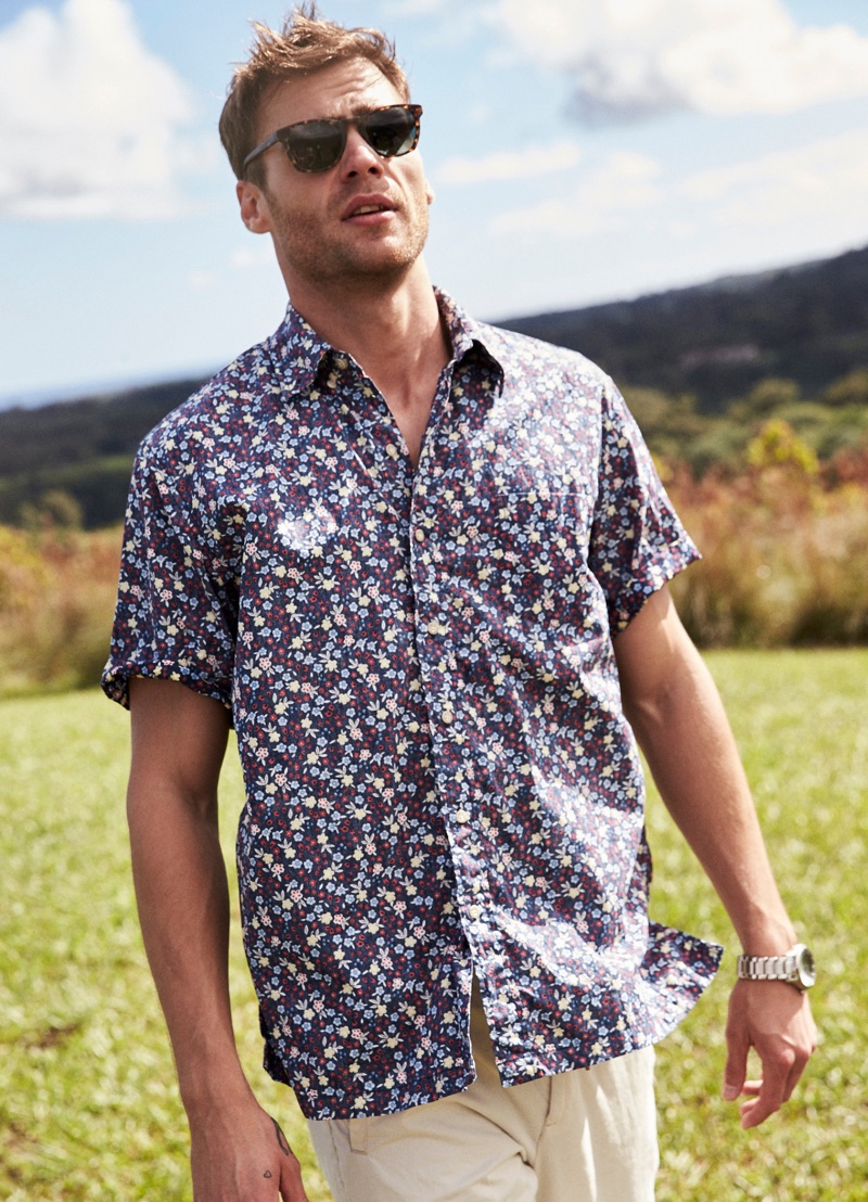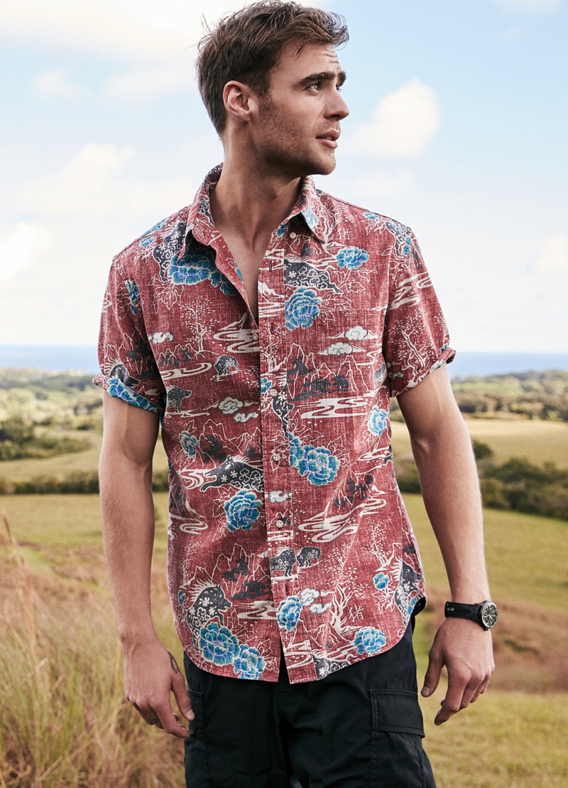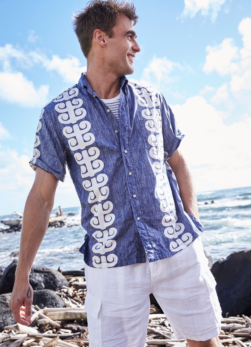 George Alsford is in a joyous mood as he embarks on a spring-summer 2019 journey with Reyn Spooner. The British model heads to Hanalei Valley Lookout in Kaui County, Hawaii for the season’s lookbook. Coliena Rentmeester photographs George, while Micah Johnson handles styling. Front and center, George wears designs from Reyn Spooner’s newly appointed creative director Doug Burkman. The lineup includes the label’s signature aloha shirts as well as graphic t-shirts and swimwear.