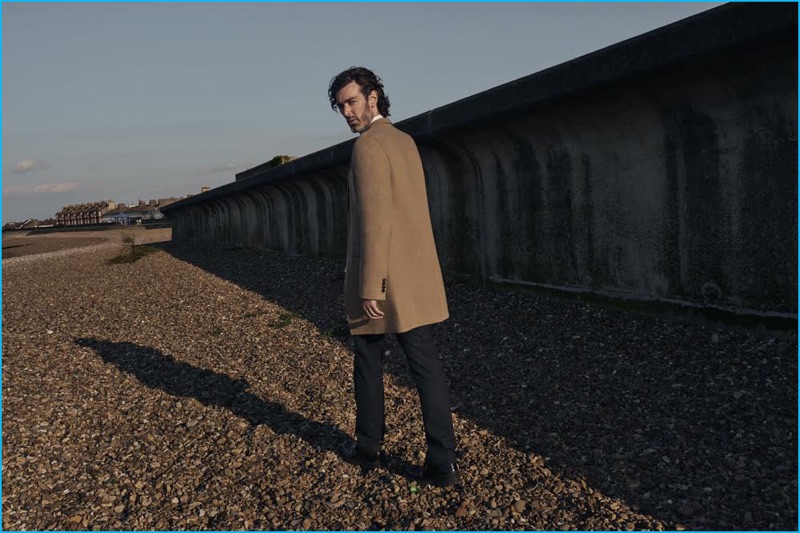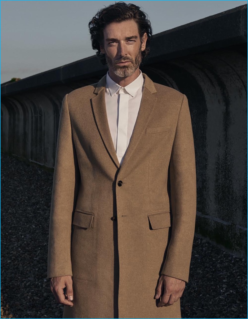 Richard Biedul dons a single-breasted camel coat and white dress shirt from Dior Homme.