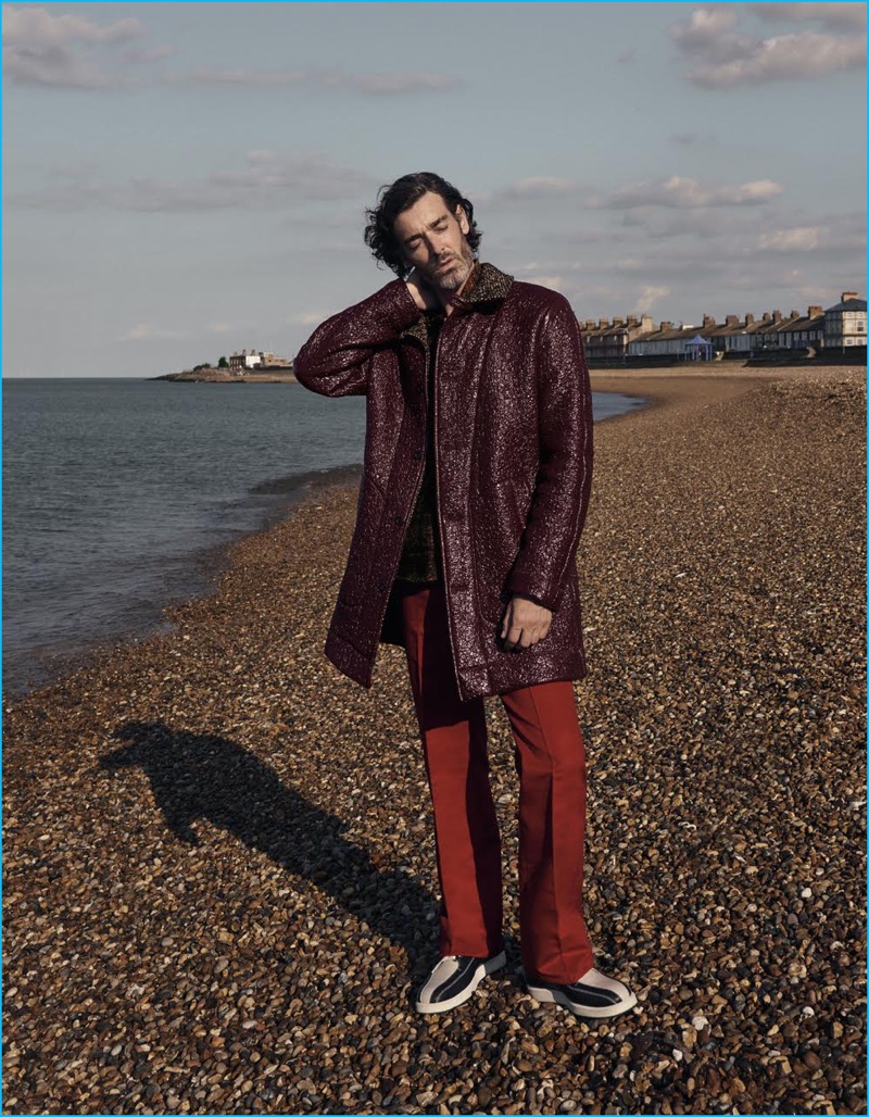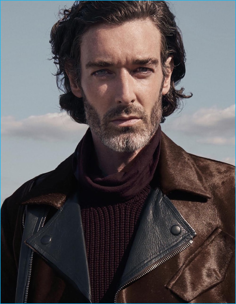 Embracing nautical style, Richard Biedul sports a shearling coat and striped sweater from Coach. The English model also dons Gucci trousers.