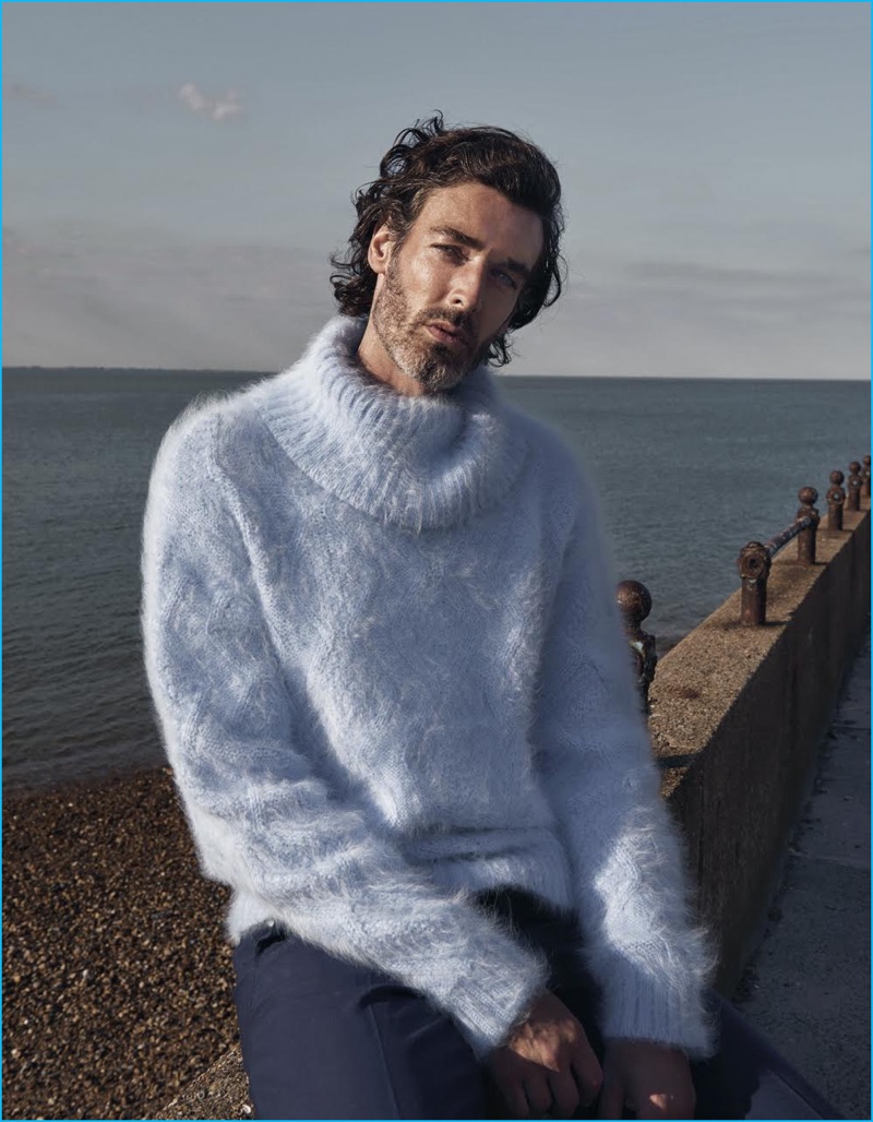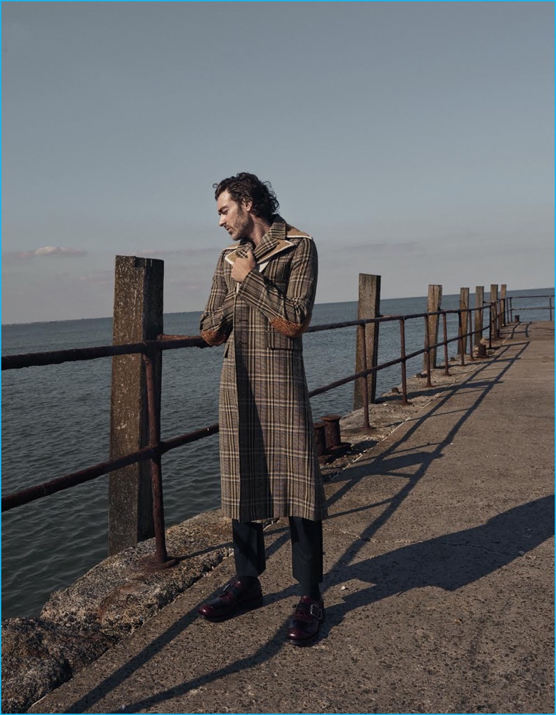 Embracing nautical style, Richard Biedul sports a shearling coat and striped sweater from Coach. The English model also dons Gucci trousers.Pin