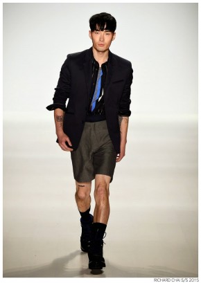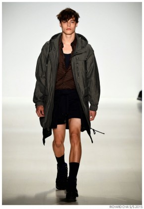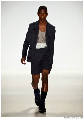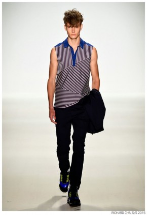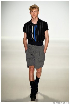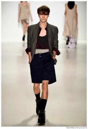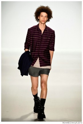 Richard Chai Spring/Summer 2015-Richard Chai delivered a chic take on sportswear for spring 2015. Hitting the catwalk, models showed leg as the inseams of Chai’s shorts shrunk. Skillfully layered, ensembles boasted a great mix of proportions as items such as the sleeveless tee or shirt jacket were reinterpreted with bright active colors and vibrant stripes. Extended shirt lengths, lightweight jackets and relaxed silhouettes contributed to a welcomed laid-back atttiude. Adding the perfect finishing touch, Chai collaborated with Timberland on hiking boots that doubled as a sneaker, adding a bold shape to lean silhouettes.