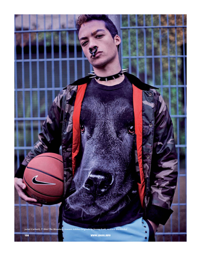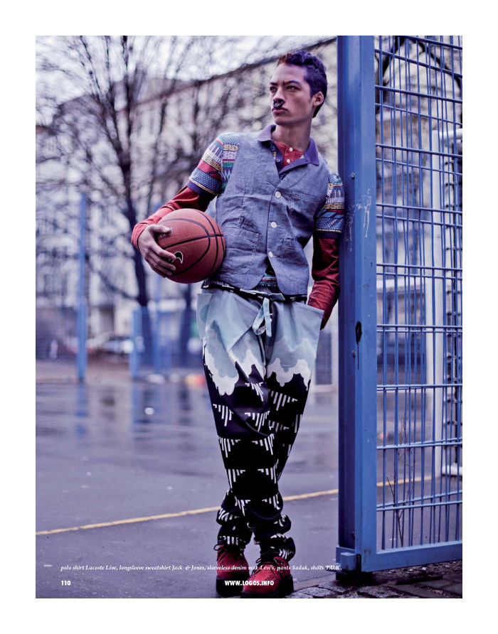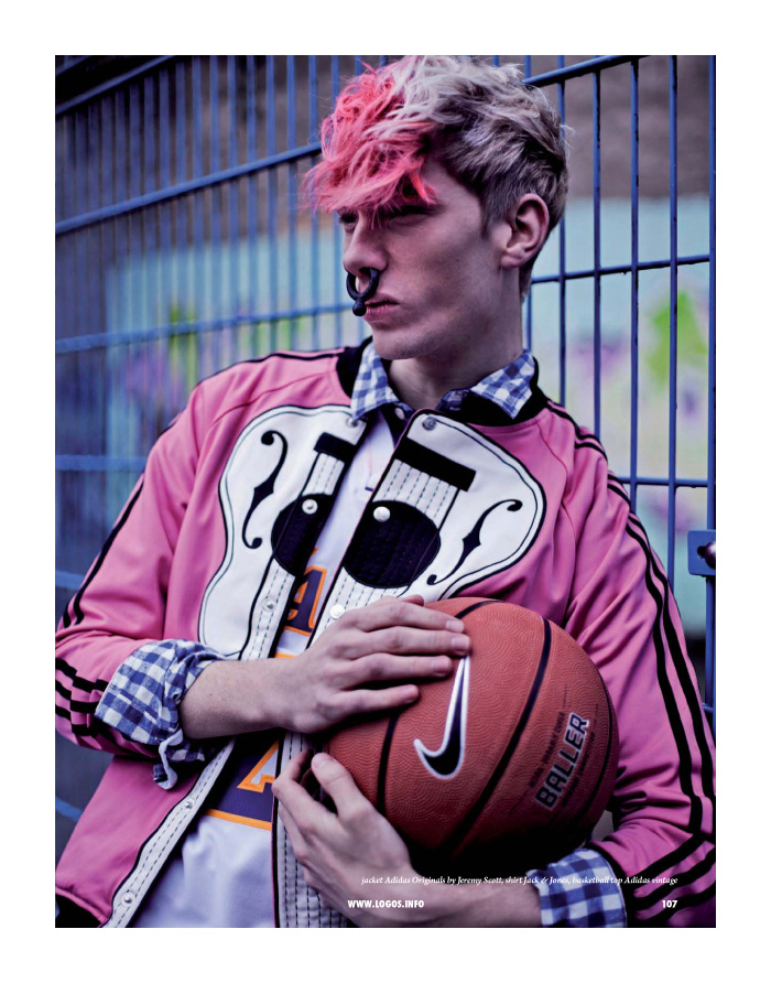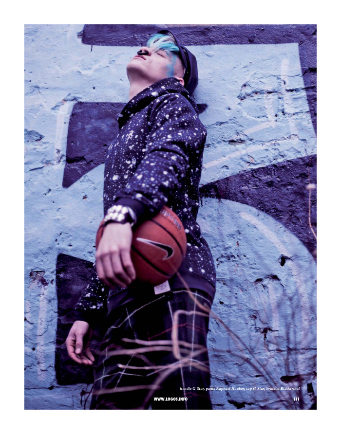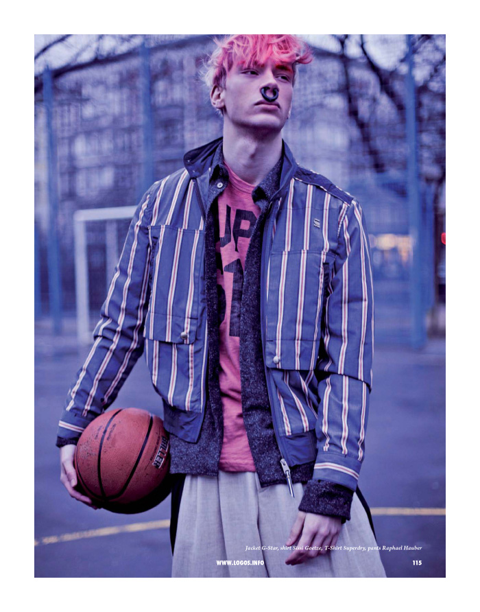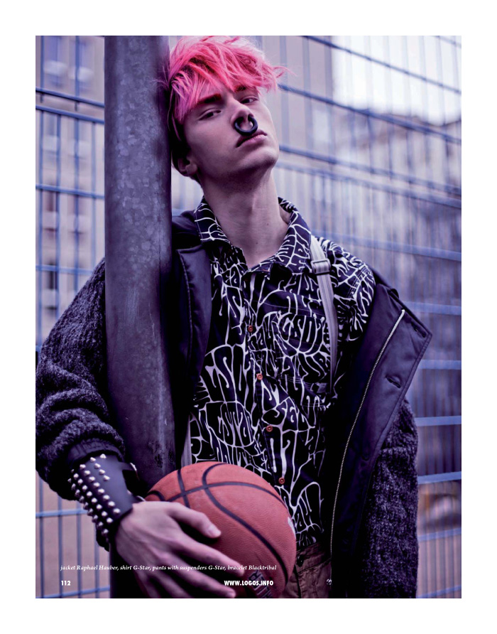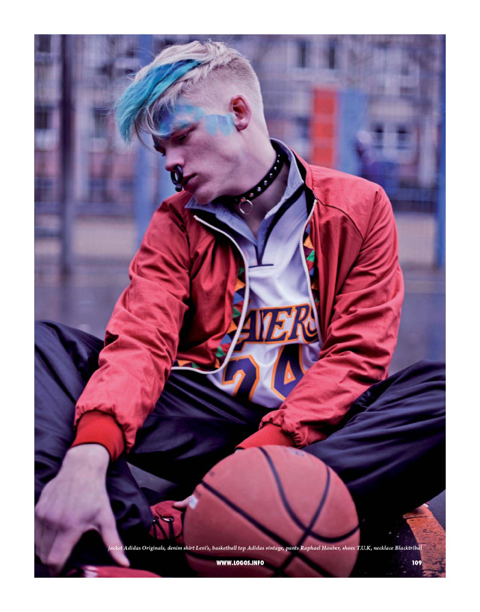 Saturday Afternoon–Models Richard Kranzin (Mega Model Agency), Aurel Mertz (IZAIO Berlin) and Jan Philip Zuelke (PMA Models) hit the concrete courts for some ball in a relaxed editorial for Sport & Street Magazine. Rocking colorful hairdos that are juxtaposed against the monochrome city of Berlin, the boys are captured by photographer Steeve Beckouet. Stylist Bodo Ernle (Nina Klein) infuses retro punk with sportswear, grunge, and jolting graphics, fitting the boys in a variety of labels such as Carhartt, Cheap Monday, G-Star and Adidas Originals by Jeremy Scott. / Hair and Makeup by Abra Kennedy (Blossom Management) and Christiane Buchholz (Nude Agency).